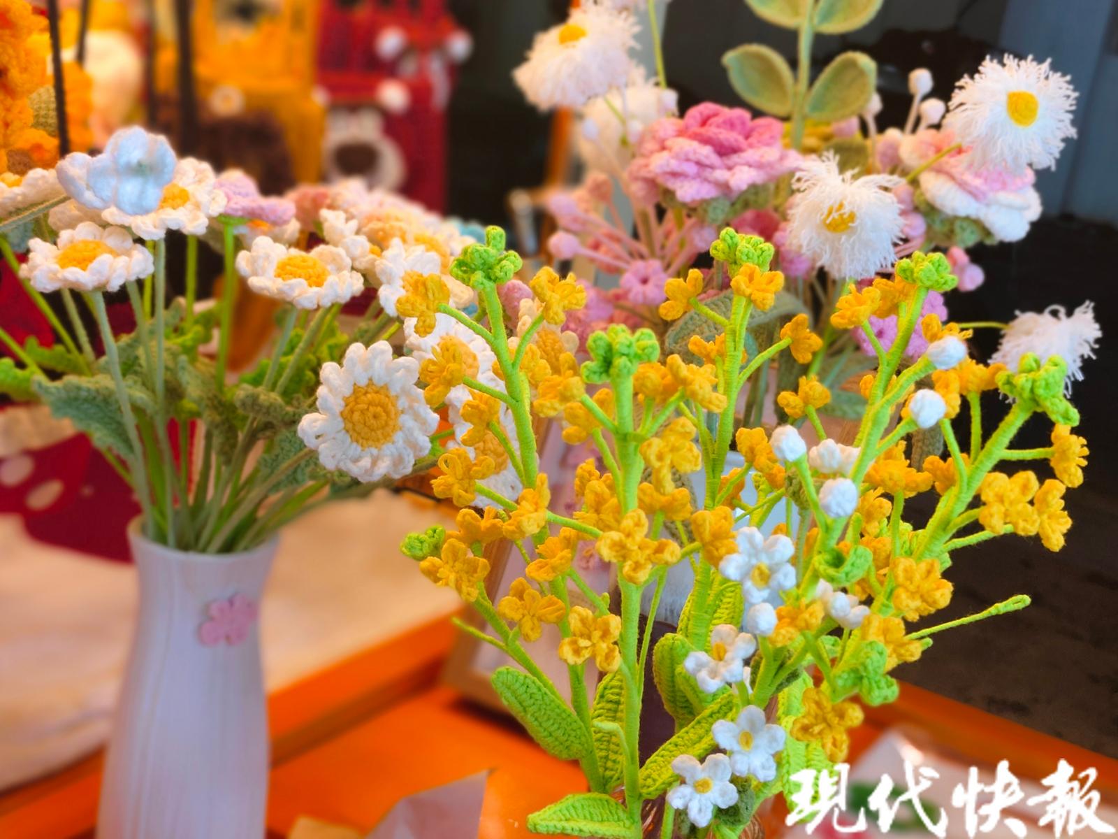 蒋女士的摊位上摆着一些古典雅致的花瓶里,插着手工针钩的雏菊、油菜花等,颇有春天气息。