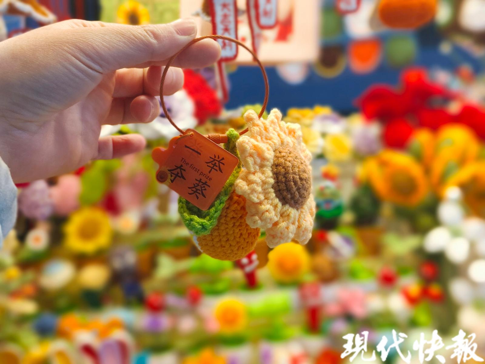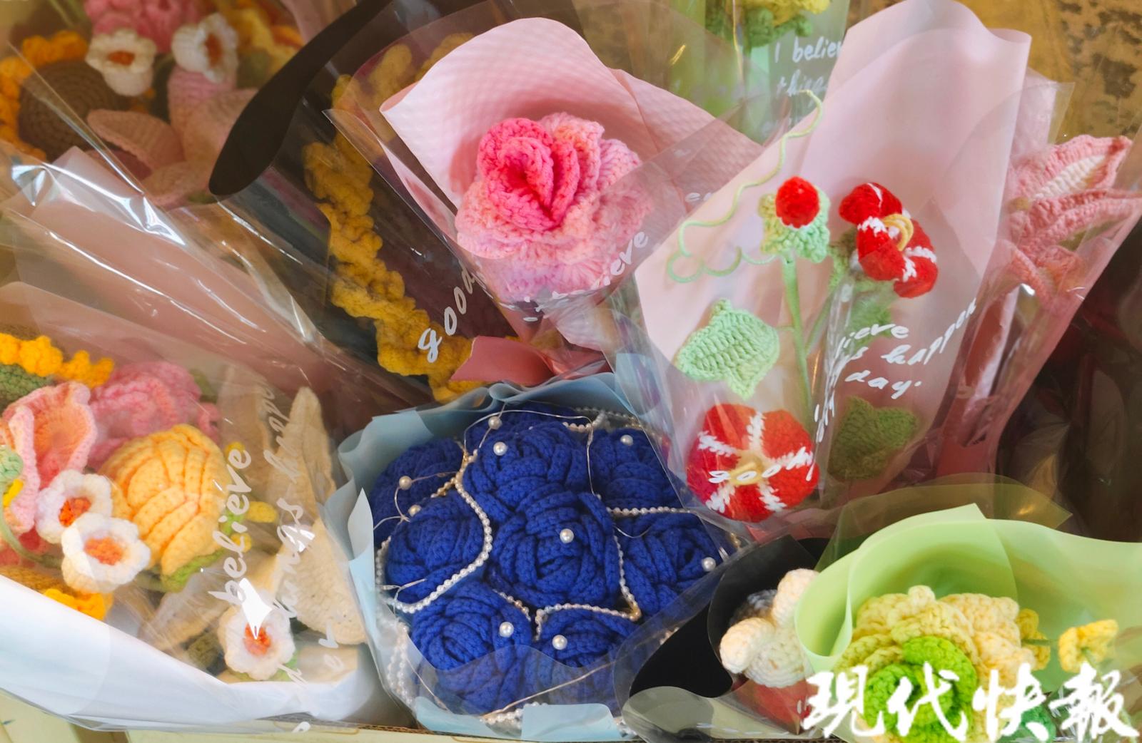 “我会根据不同的季节,制作不同的针织品。比如春天是花花世界,便钩织了各式花儿。”蒋女士说着拿起一支大向日葵,“这是亲戚预订的。因为他家孩子今年要高考了,祝他一举夺魁(葵)。”