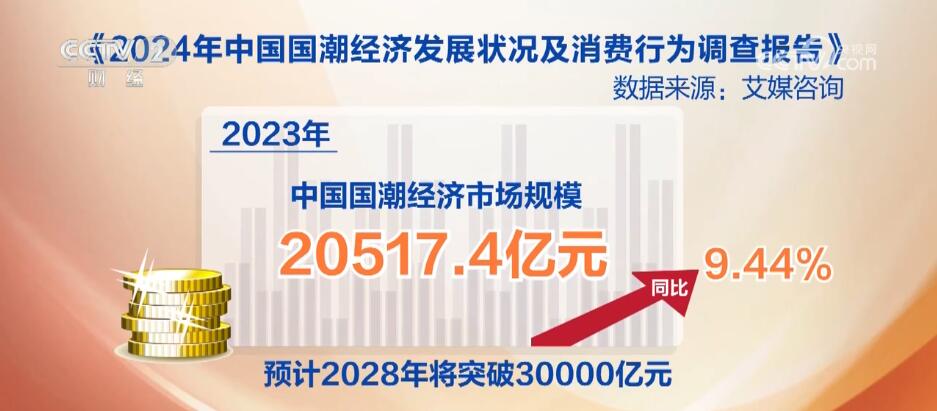 据调查,2023年中国“国潮”经济市场规模为20517.4亿元,同比增长9.44%,预计2028年将突破30000亿元。