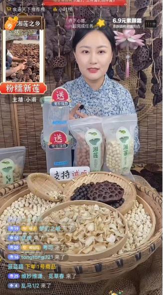 为持续拓宽销售渠道,湘潭县还大力培训电商人才、组建电商团队、搭建电商平台,发展“互联网+”销售模式。如,湘潭远航莲业有限公司深耕电商领域,致力于湖南湘潭地标产品湘莲的推广和销售,扎根乡土,以乡品,诉乡情。通过直播电商、视频电商、社交电商等新兴电商模式,面向全国各地的消费者,传播湘莲文化,分享湘莲美食,推介湘莲产品,同时促进农户增收,培养直播电商人才、带动返乡创业。“我们公司2021年组建团队进军抖音直播电商,创立的湘莲IP品牌“小茵姑娘”,目前做到抖音莲子类目第一,店铺总销量超110万单,2023年抖店年销售超2000万元。项目曾获湖南省首届“耀动三湘”网络创业直播大赛市赛一等奖、获湖南省第七届农村创业大赛市赛三等奖。”湘潭远航莲业有限公司负责人颜琨骄傲地说。