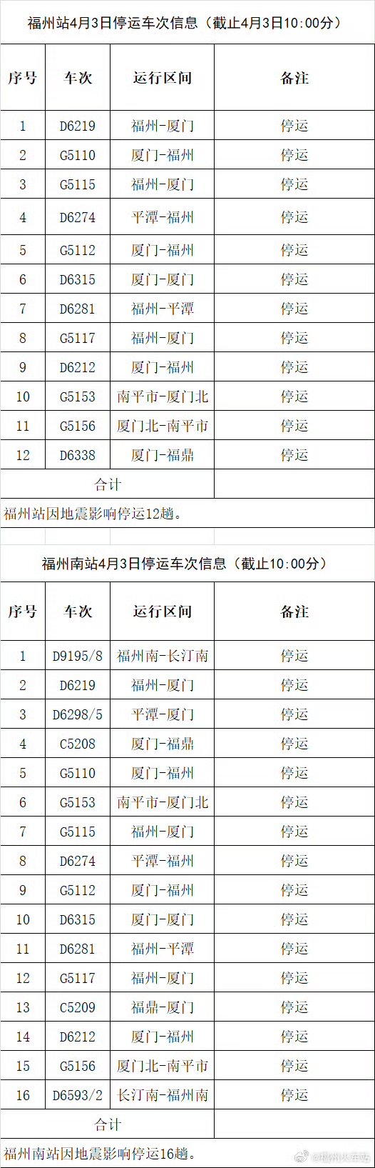4月3日7时58分,台湾花莲县海域发生7.3级地震,受此影响,4月3日福州火车站停运部分旅客列车,具体如下:(数据截至4月3日10时)