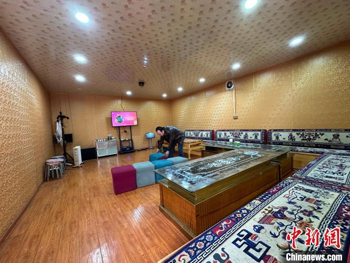 图为村民申占彪在自家改造后的KTV“豪包”内打扫卫生。 魏建军摄