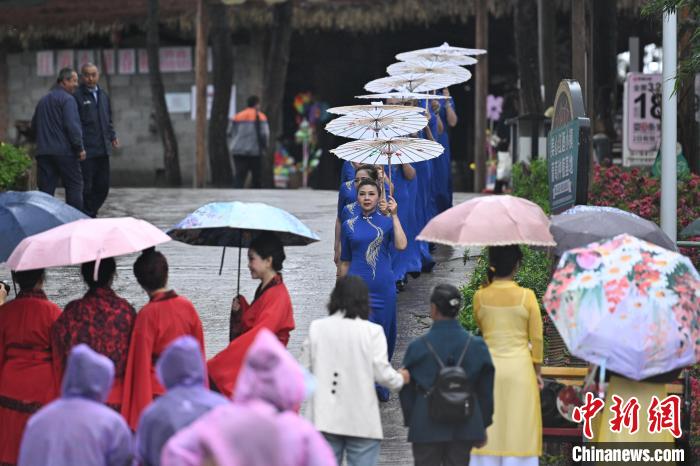 图为走秀舞蹈吸引游客。 中新网记者何蓬磊摄