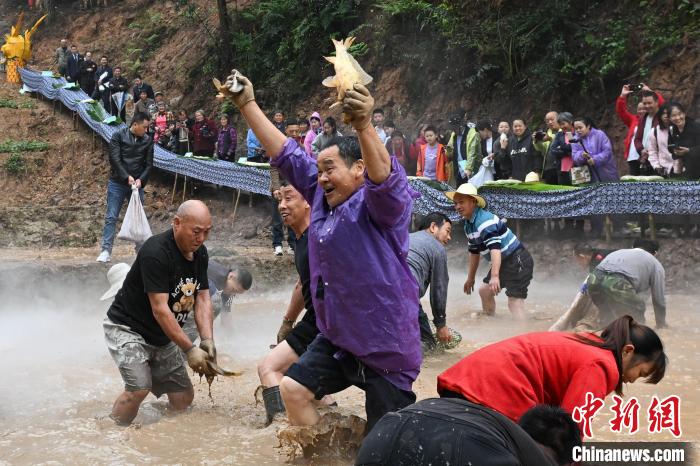 图为“浑水摸鱼”活动吸引游客和当地民众围观。 中新网记者何蓬磊摄