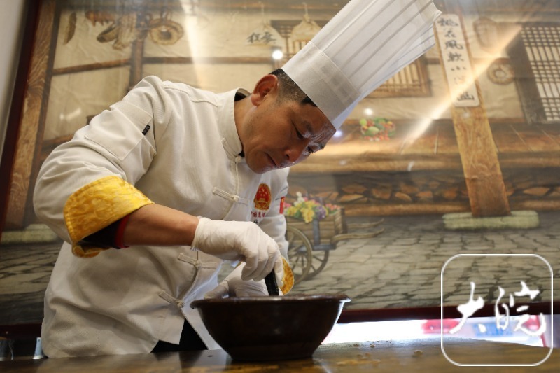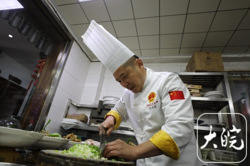 “我只读过小学,文化不高,就是喜欢做菜,喜欢研究制作各种菜,喜欢把与寿县相关的文化融入到我的菜里。”张士宏说,他15岁开始学习厨艺,后来在当地一家百年老字号饭店里做行政总厨,2006年出来单干,开了属于自己的这家餐馆,研究自己喜爱的菜品。