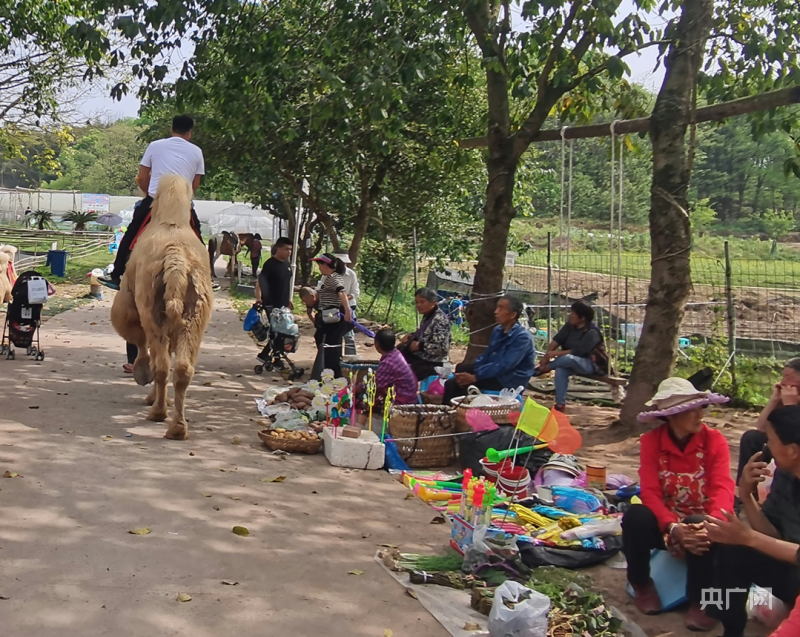游客骑骆驼经过农家乐附近的乡村集市(央广网发贾扬帆摄)