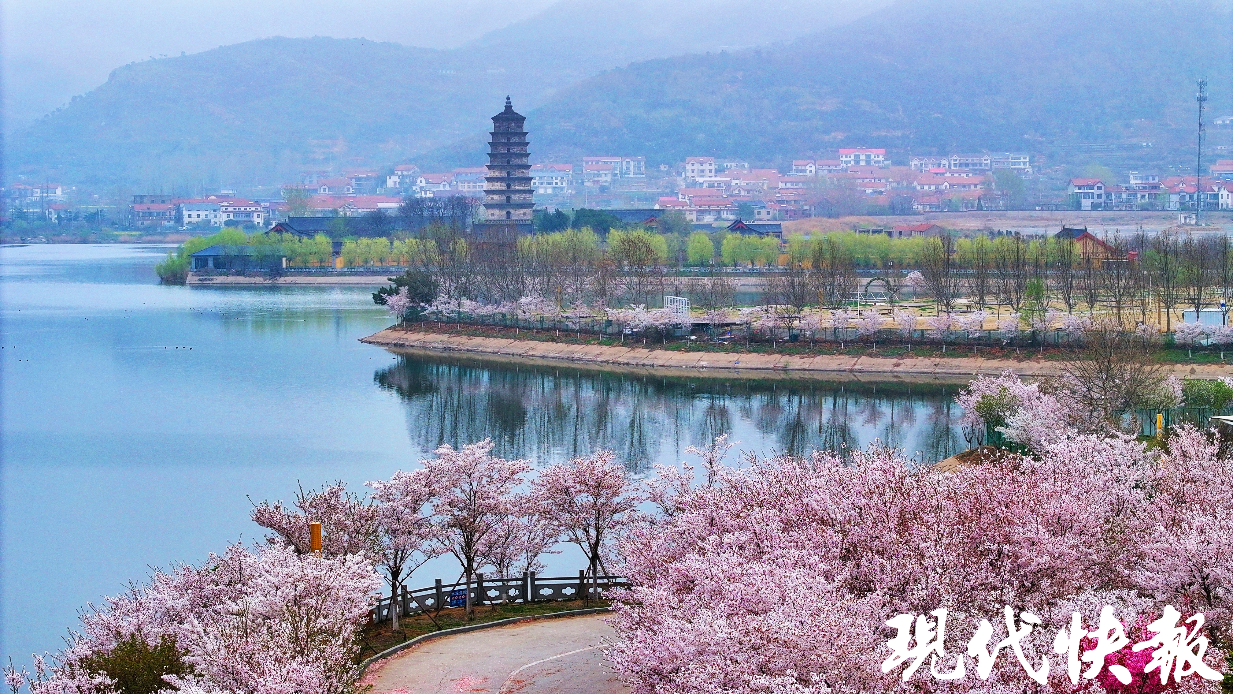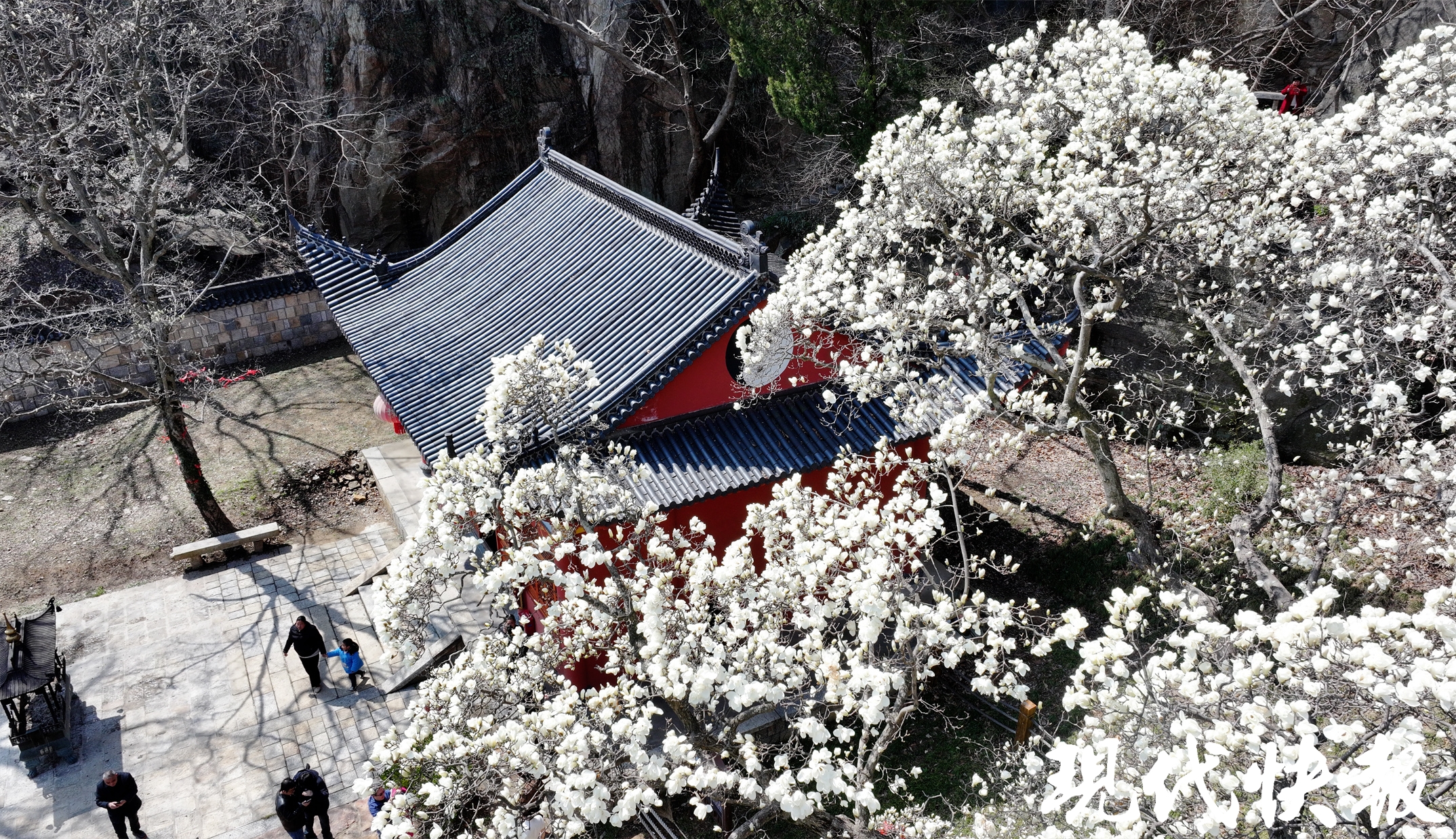 在东磊景区延福观,千年“玉兰花王”吐蕊绽放,盛开的树冠像一大片白云弥漫在半山之间,繁花盛开、清香迷人,构成一幅美轮美奂的春日美景图。不少游客“闻”香而来,自拍、赏花、游玩,穿行在“花海”中,感受大自然的气息。