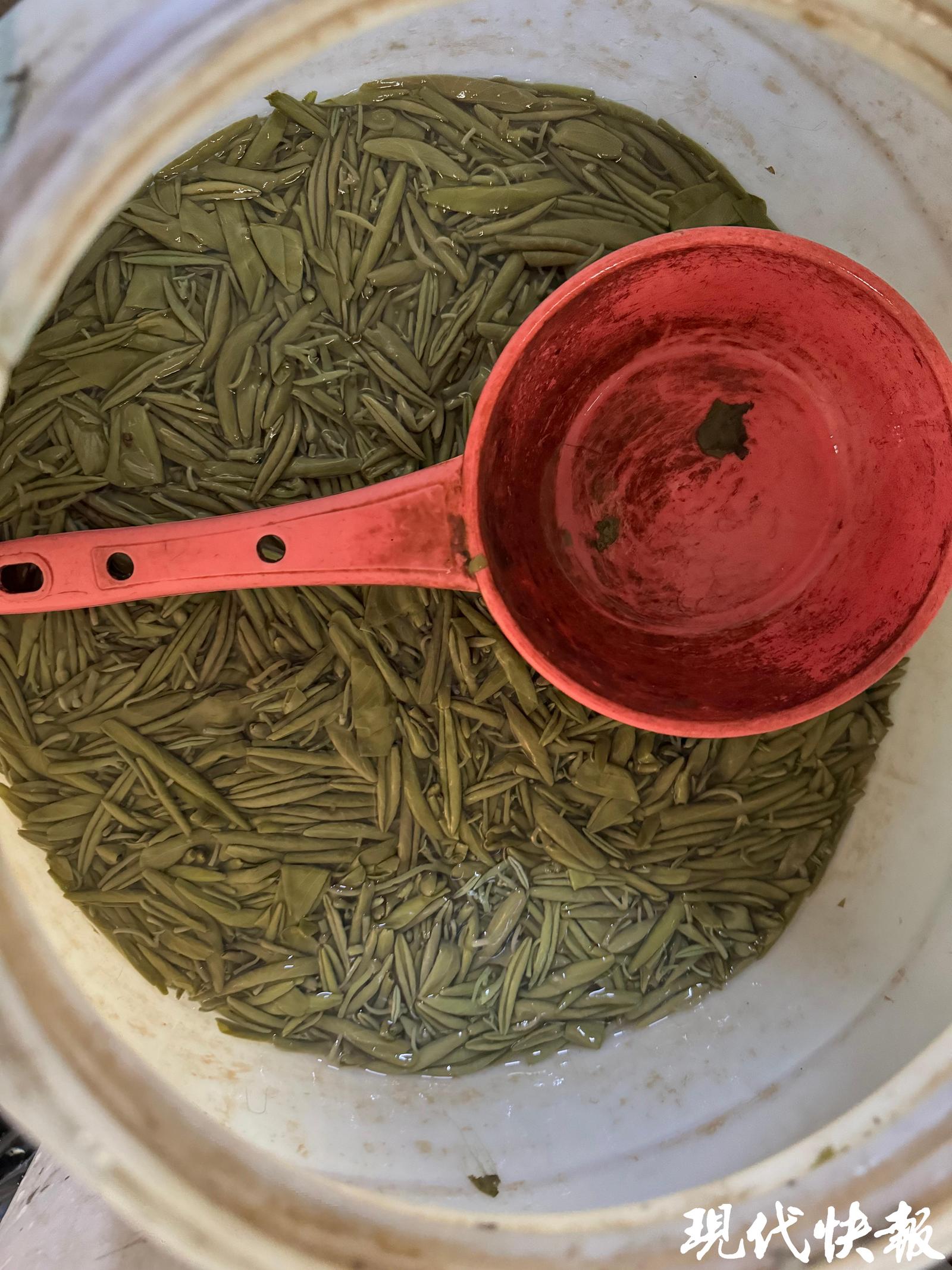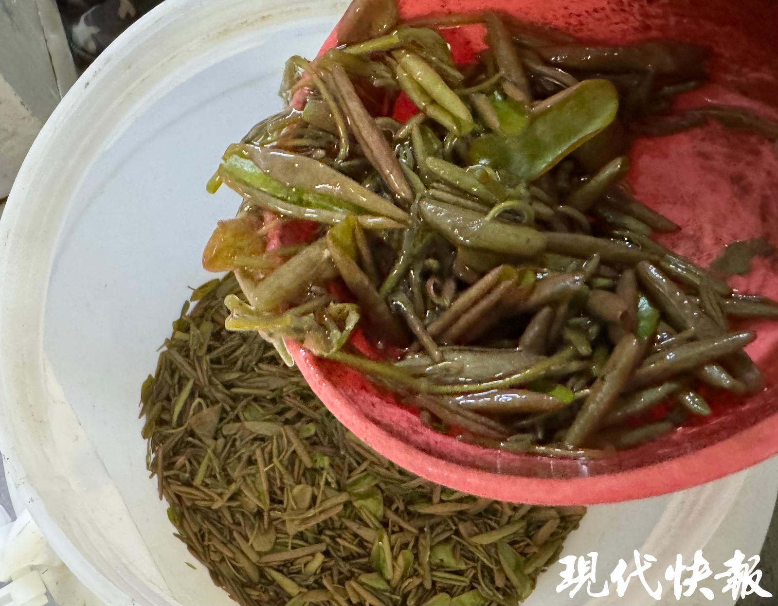 在南环桥市场水产交易区,一桶桶浸泡在清水里的新鲜莼菜,被放在较为显眼的位置进行售卖。“今年上市的新鲜莼菜几乎都来自苏州本地,目前上市量较少,所以价格偏贵。”据市场有关负责人介绍,太湖莼菜作为苏州特产和国家地理标志产品,一直备受市民喜爱,目前上市的主要来自苏州东山地区。