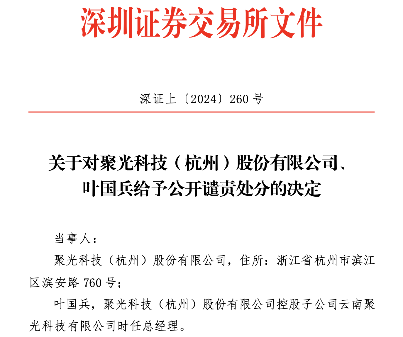 随后的4月7日,聚光科技再度公告披露,就上述行贿罪事件,深交所于4月6日给予聚光科技、云聚科技时任总经理叶国兵给予公开谴责的处分。对于公司及相关当事人的违规行为和处分,深交所将记入上市公司诚信档案。