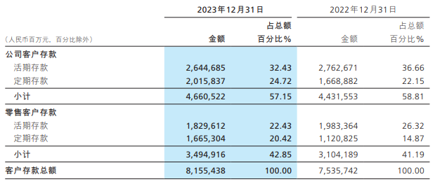 除了贷款难之外,银行最喜欢的活期存款也在减少。一般情况下,更多的活期存款意味着更低的负债成本,当前存款的定期化、长期化的趋势特征比较明显。据2023年报,招行的存款定期化特征明显,企业和居民活期存款均出现同比下降。