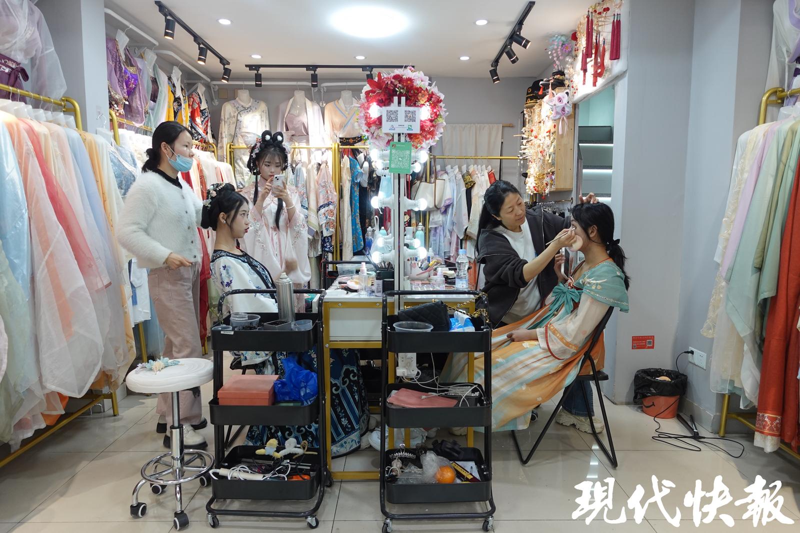 正在店内挑选旗袍的原女士表示,她与男友是从广东前来南京旅游的,“我有旗袍,带出来弄脏了还要去干洗,再说我自己也不会做旗袍的妆造。”她说,自己预约了下午南京博物院的票,准备来租一件旗袍去民国馆拍照。