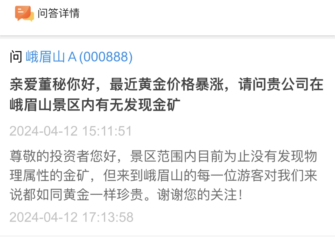 4月12日,有投资者在互动平台向峨眉山A(000888.SZ)提问称:最近黄金价格暴涨,请问贵公司在峨眉山景区内有无发现金矿?