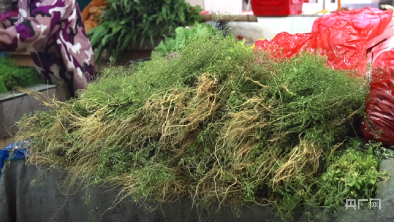 摊位上摆放的一把把地菜(央广网发张潇悦摄)