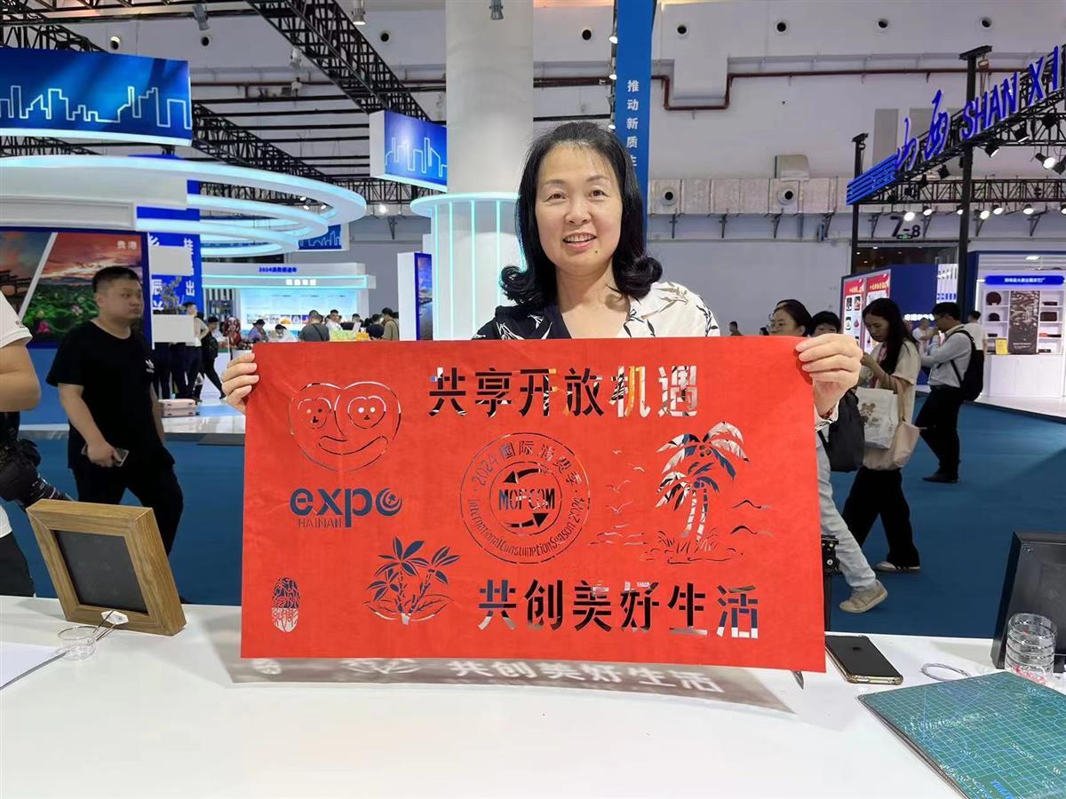 “仙桃雕花剪纸是人类非物质文化遗产,主要以雕刻为主。这次我们专门设计了以消博会为主题的剪纸,耗时两天制作完成。”仙桃雕花剪纸市级传承人张慧介绍,近年来仙桃雕花剪纸注重传承创新发展,把传统技艺融入现代生活、服务现代生活。