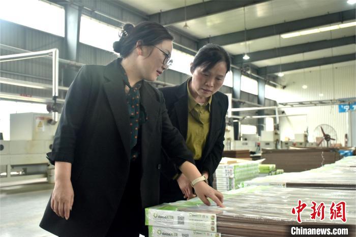 图为资溪县竹科技产业园内,江西大觉山旅游投资集团有限公司董事长陆红英(左一)在与企业负责人交流沟通。巫发阳摄