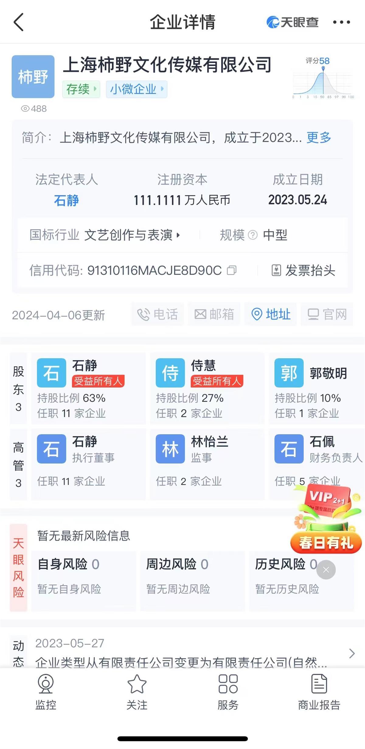 人气如此火爆的化妆室,真的是郭敬明开的吗?记者查询天眼查,资料显示,商标“SHISPACE”所属公司为柿柿橙(上海)文化传媒有限公司,其大股东和实际控制人为石静。公司有3位股东,大股东石静持股76%,认缴出资额76万元;二股东侍慧持股19%,认缴出资额19万元;三股东许晨艳持股5%,认缴出资额5万元。