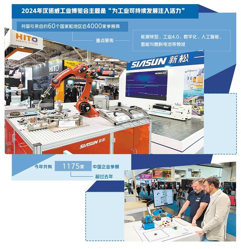 据展会主办方德意志会展公司介绍,今年共有1175家中国企业参展,超过去年的近1000家。这些企业纷纷携最新工业产品和示例参展,向来自全球的参展商和观众展示了中国企业的创新力量,向世界传递中国高质量发展的趋势与信心。