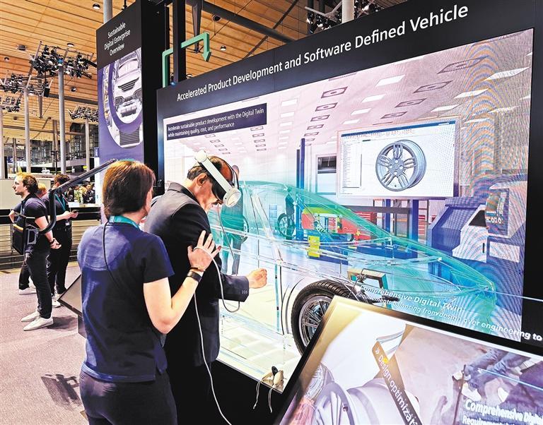 图为在汉诺威工业博览会上,观众正在体验西门子公司应用于汽车制造领域的数字孪生技术。本报记者陈希蒙摄