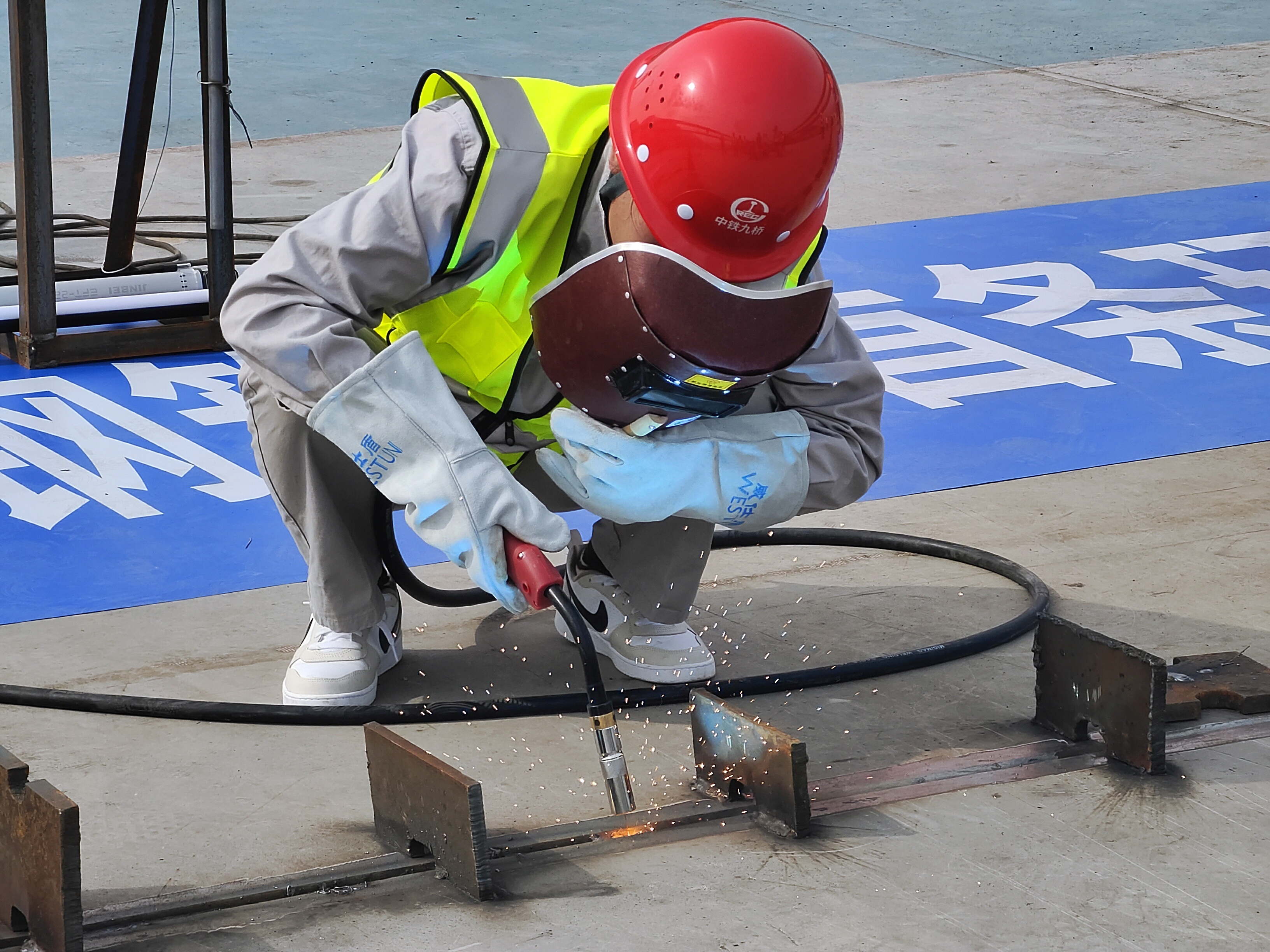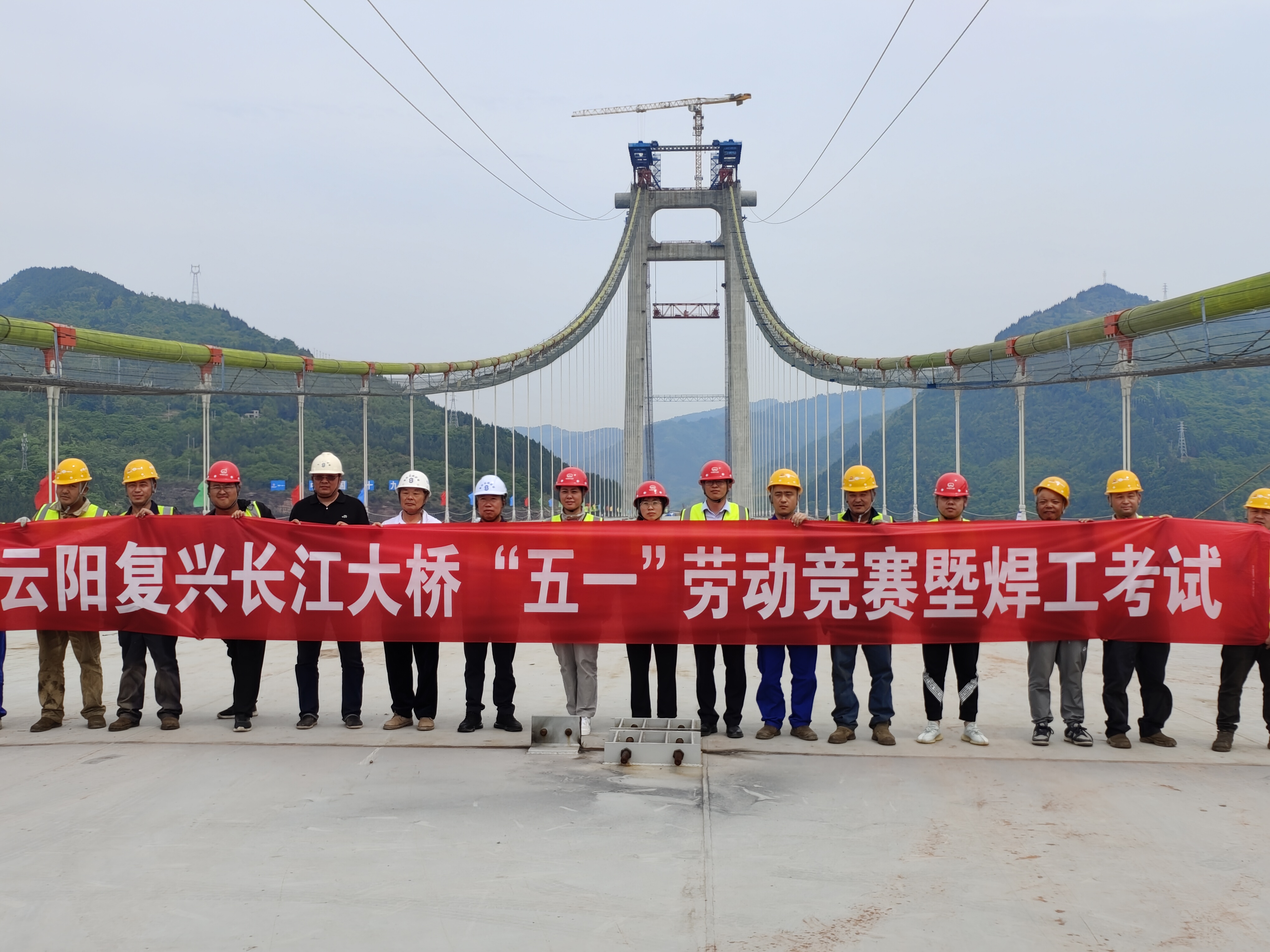 在“五一”国际劳动节来临之际,为大力弘扬劳模精神、劳动精神、工匠精神,展现劳模风采,在云阳复兴长江大桥主桥钢梁首条焊缝焊接施工现场,中铁大桥局特别邀请了“全国五一劳动奖章”“全国劳动模范”“全国技术能手”等多项荣誉称号的电焊工匠技师——王中美,“全国技术能手”、第44届世界技能大赛焊接项目冠军——宁显海给现场工人们进行专业指导。