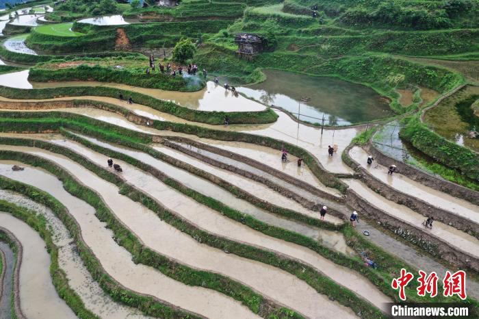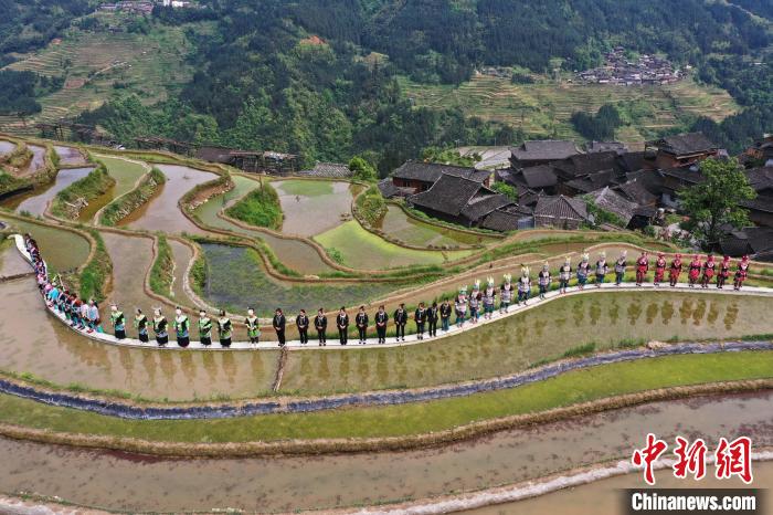 加榜梯田“开秧门”祭祀仪式,迎来众多海内外游客观看。仪式现场,身穿民族服饰的苗族同胞纷纷挽起裤腿,走进蓄满水的稻田里,表演着农事活动。田坎上的年轻人也没有闲着,敞开嗓子进行山歌对唱,展现传承千年的农耕文化和民族风情。