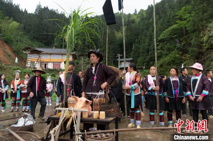 4月27日,村民在贵州省从江县加榜梯田“开秧门”活动上展示祭祀习俗。吴德军 摄
