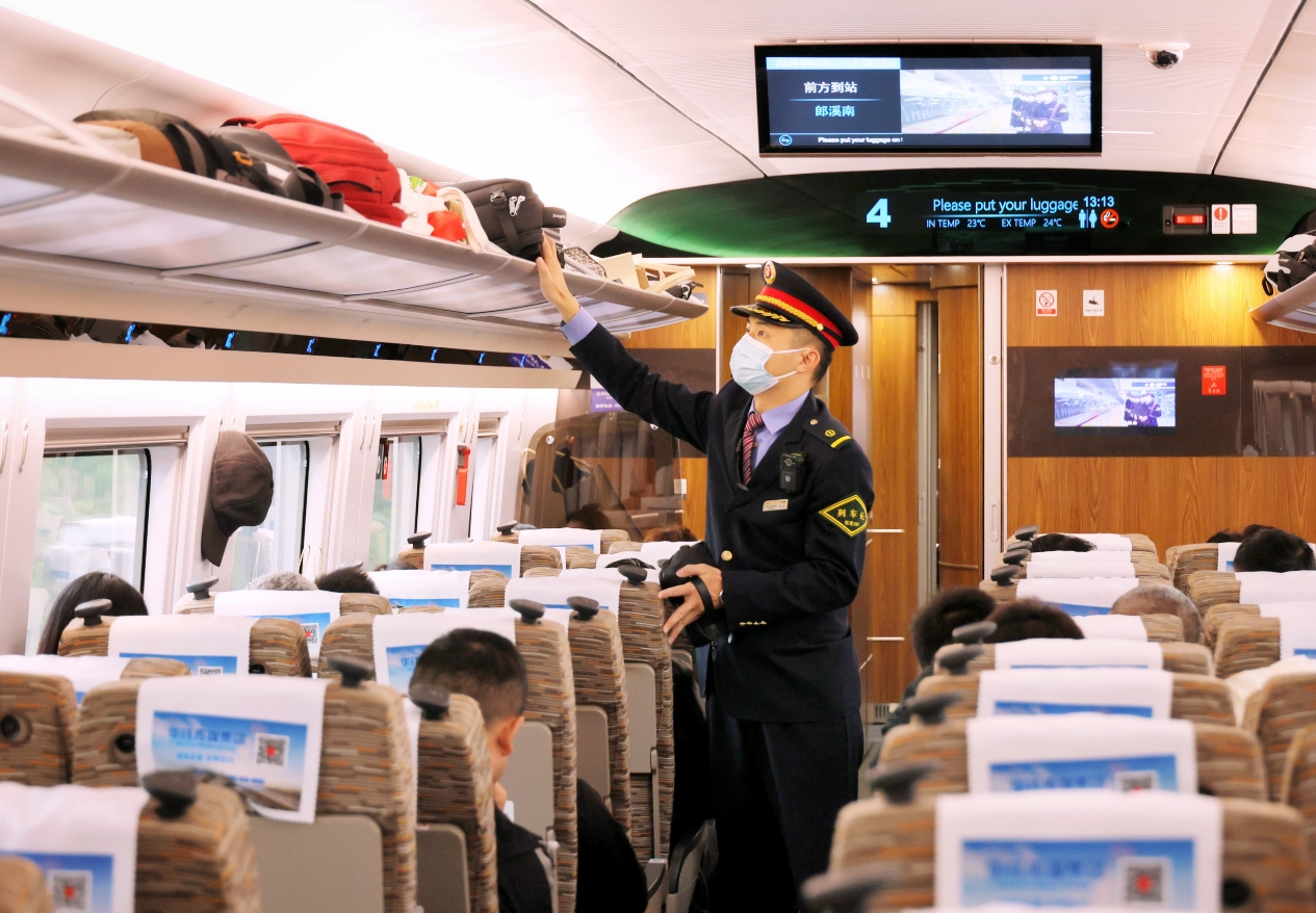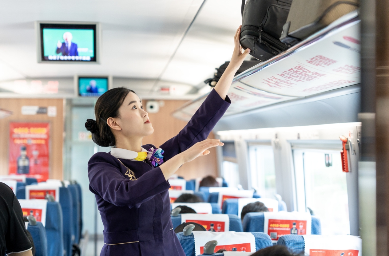 合肥客运段列车乘务员整理行李架上物品。吴臻皓摄