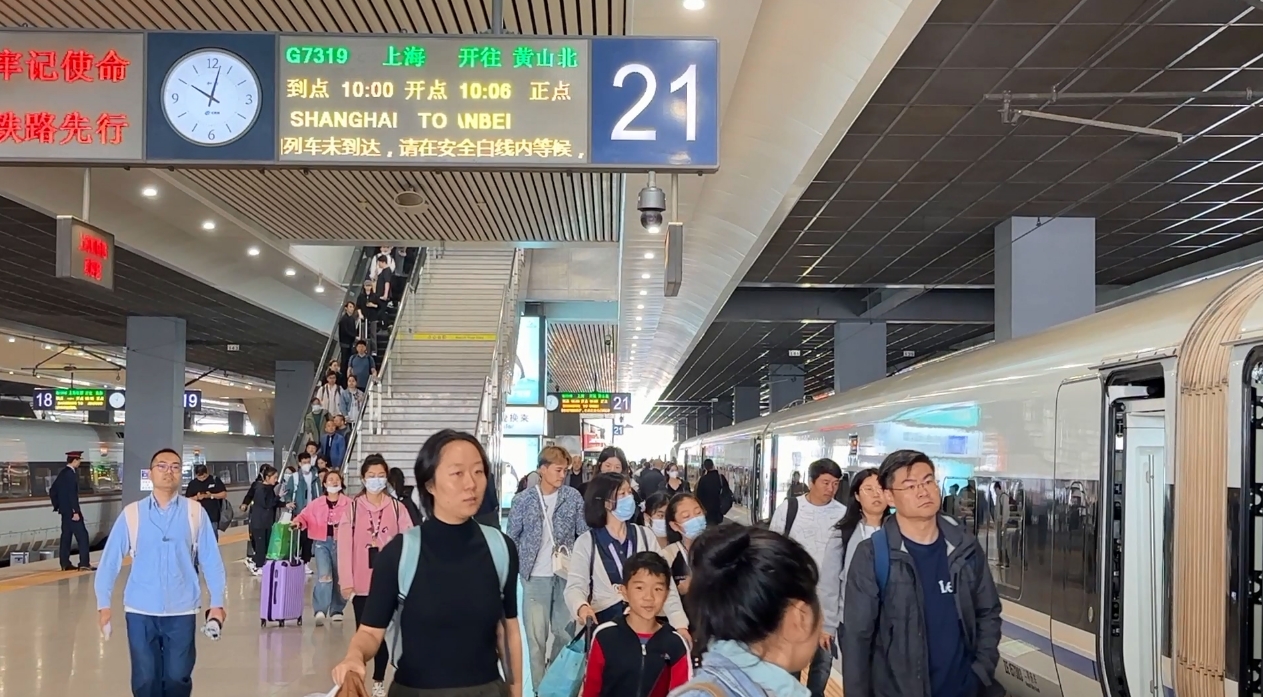 澎湃新闻记者从中国铁路上海局集团有限公司获悉,5月2日是“五一”小长假第二天,长三角铁路预计发送旅客超360万人次,客流持续处于高位运行。铁路部门在启用高峰线运行图的基础上,计划增开至广州、厦门、南昌、武汉、汉口、郑州、洛阳等方向214列旅客列车,对203列动车组列车组织重联运行,加挂普速客车133辆,全力满足假期旅客出行需要。假期旅客出行集中,铁路部门提醒旅客千万不要踩点出门,而要适当提前出门,为市内交通、进站安检等环节预留充足时间。