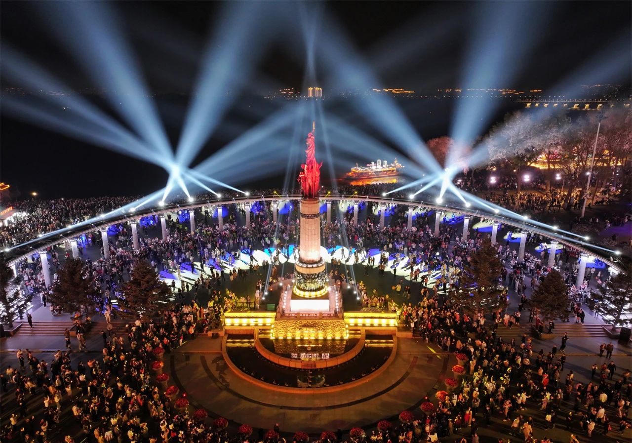 光影秀点亮哈尔滨防洪纪念塔(央广网发黑龙江省文旅厅供图)
