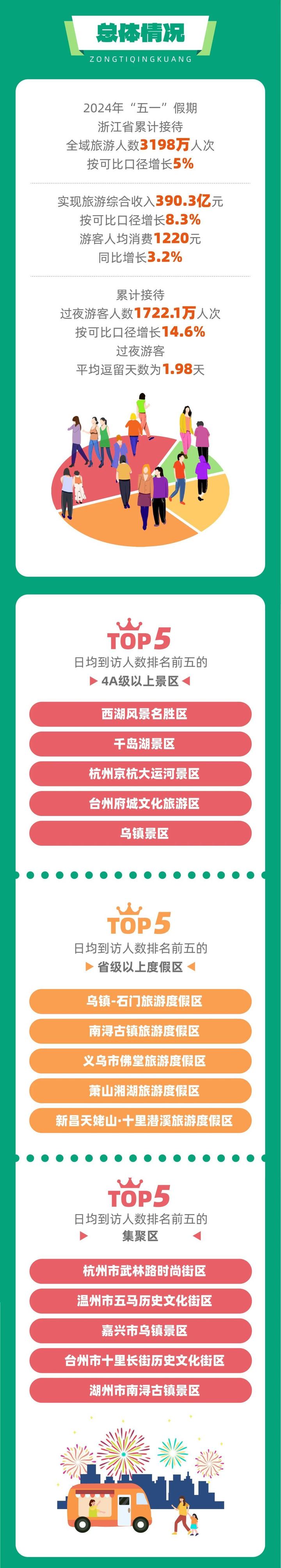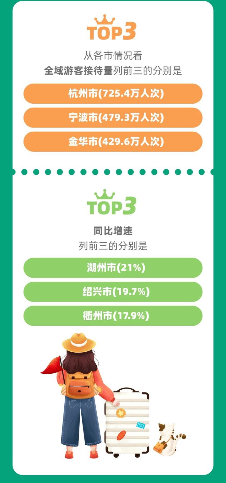 从总体看,接待游客人次、旅游收入总量等主要指标均创历史新高。据美团数据显示,浙江省旅游总接待人次和消费规模均名列前茅,日均游客接待规模同比增速为40.9%,较节前1周环比增速为116.1%;日均文旅消费规模同比增速为35.1%,较节前1周环比增速为158.5%。