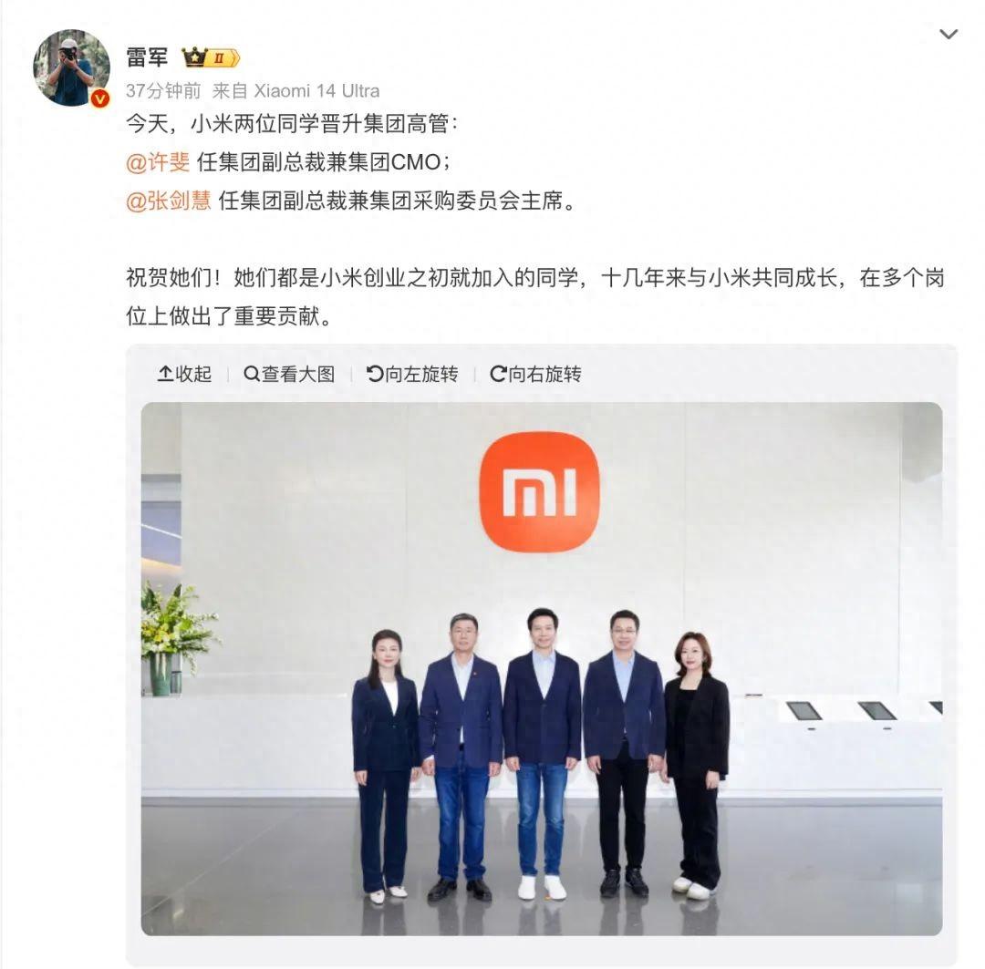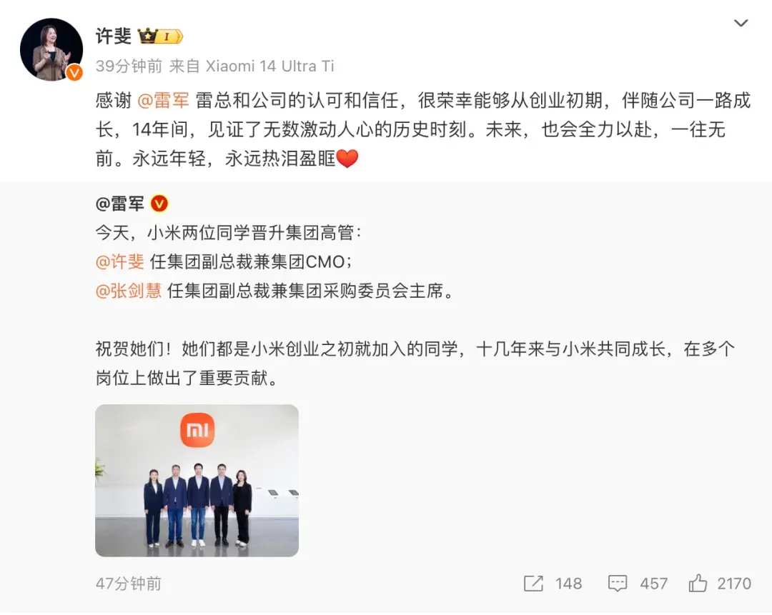 对此,许斐发文表示:感谢雷总和公司的认可和信任,很荣幸能够从创业初期,伴随公司一路成长,14年间,见证了无数激动人心的历史时刻。未来,也会全力以赴,一往无前。永远年轻,永远热泪盈眶。