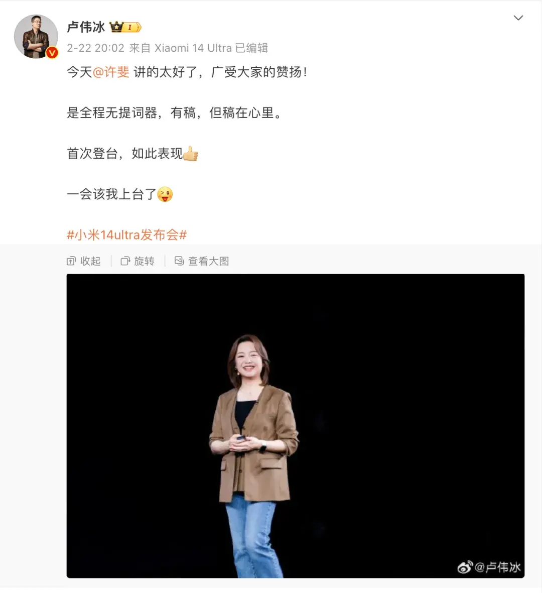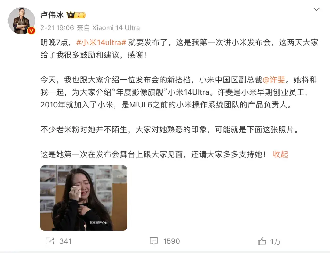 2月21日,卢伟冰就发微博透露,许斐将参与此次小米14 Ultra发布会,她将给大家做精彩的产品介绍。