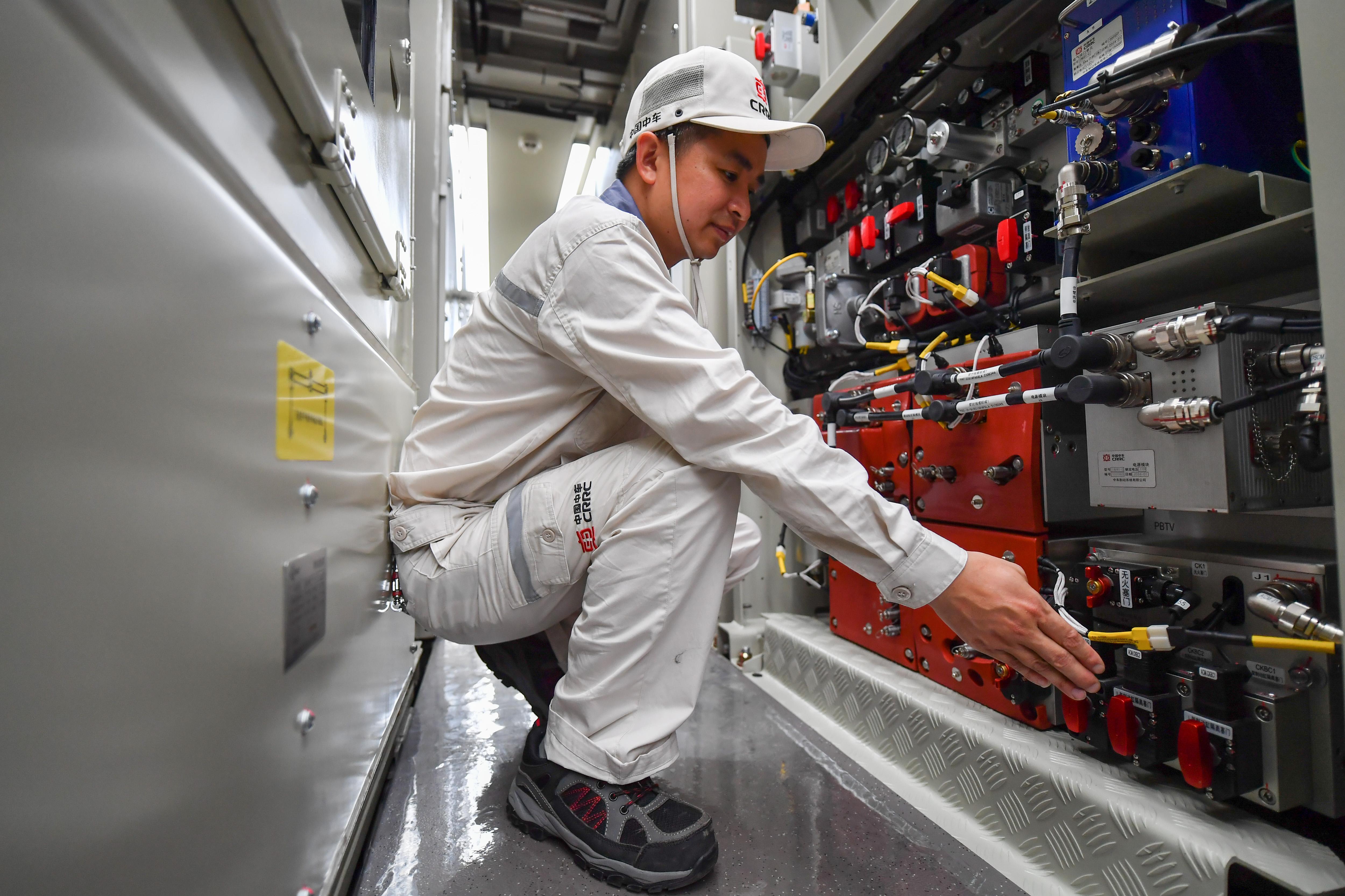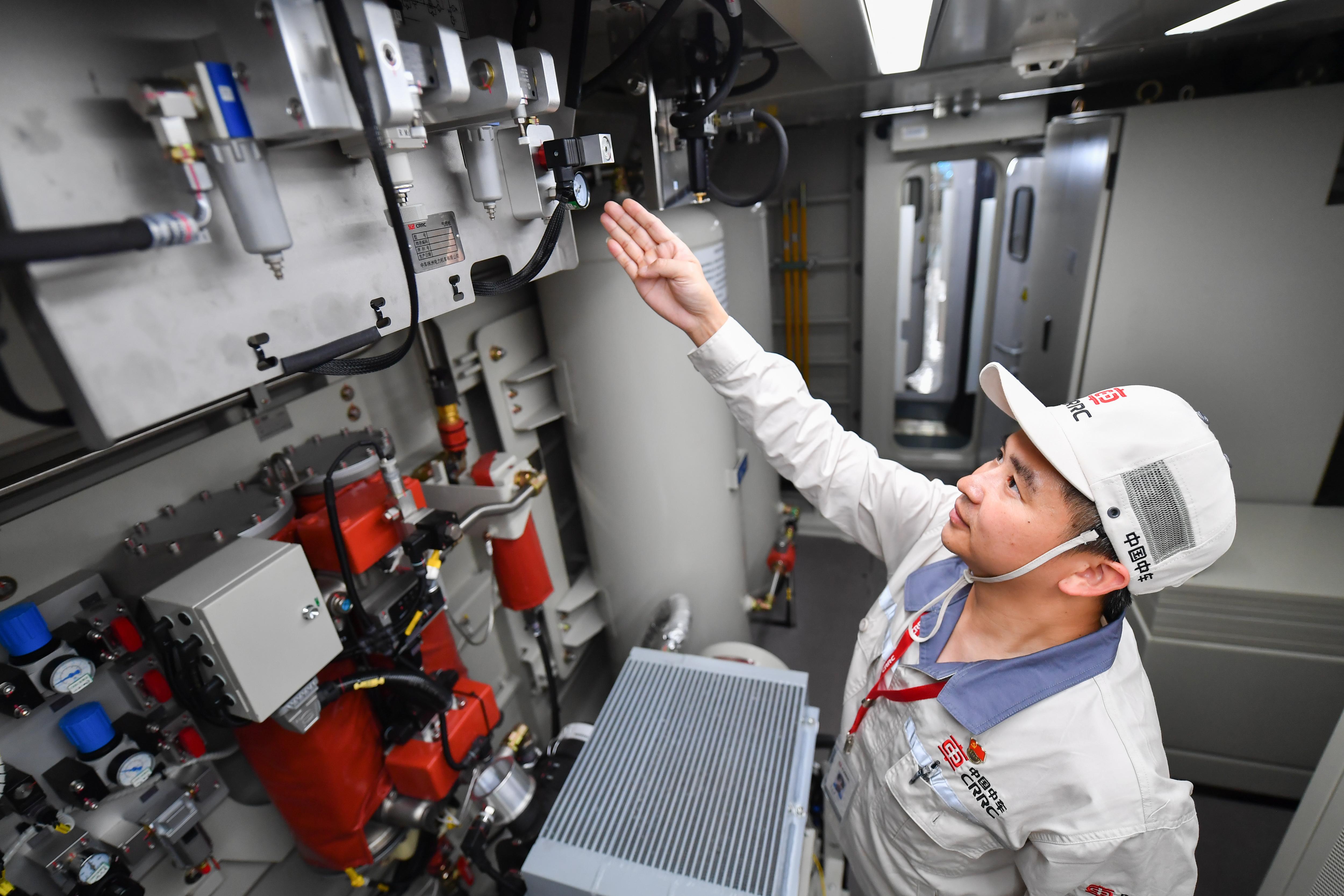 5月9日,工作人员在机车的机械间巡检。 新华社记者 陈泽国 摄