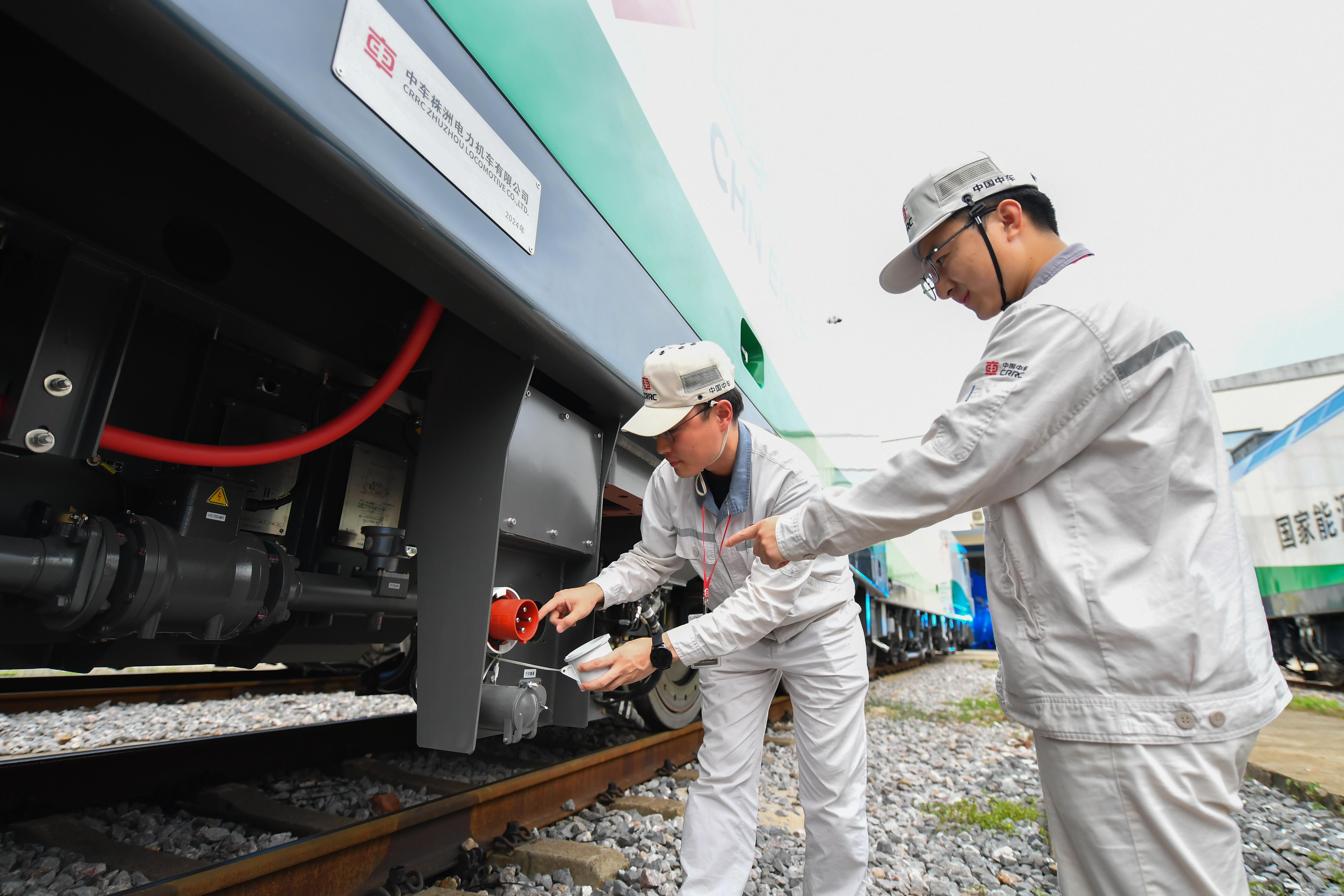 5月9日,工作人员在机车外巡检。 新华社记者 陈泽国 摄