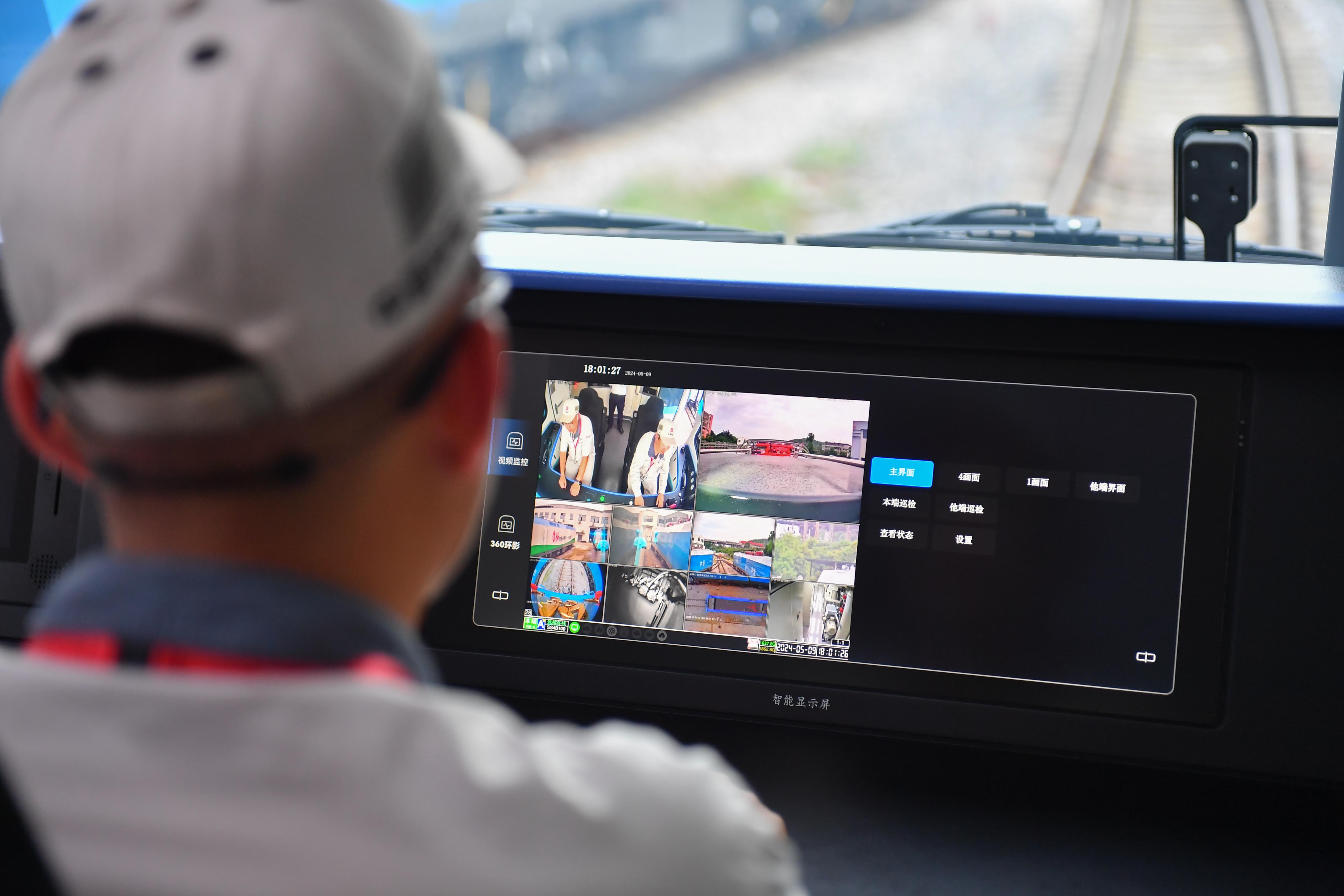 5月9日,工作人员在机车的智能座舱内查看视频监控、360环影的运行情况。 新华社记者 陈泽国 摄