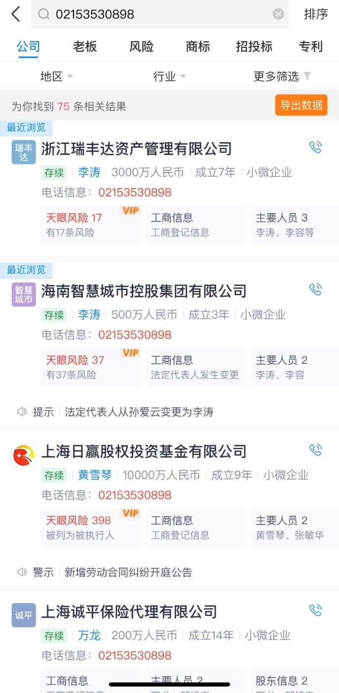此外,记者通过天眼查APP查阅发现,与瑞丰达共用同一个办公电话的企业多达75家,其中包括超20家以“日赢”开头的公司。相关企业均为日赢控股的旗下企业或关联企业。