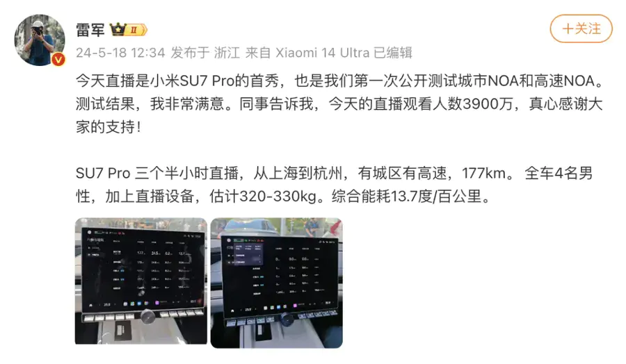 在直播结束后,雷军发微博表示:“今天直播是小米SU7Pro的首秀,也是我们第一次公开测试城市NOA和高速NOA。测试结果,我非常满意。”