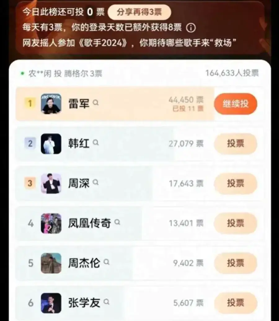 近日,雷军登顶《歌手2024》摇人榜,力压韩红、凤凰传奇、周杰伦、张学友等,获得了大量网友的支持。