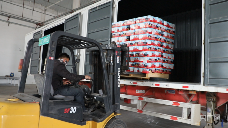 在阿拉山口边民互市项目一级市场,满载货物的集装箱卡车来回穿梭。工作人员正娴熟地操作设备,将一箱箱从哈萨克斯坦进口的李子干装车,发往疆外销售。
