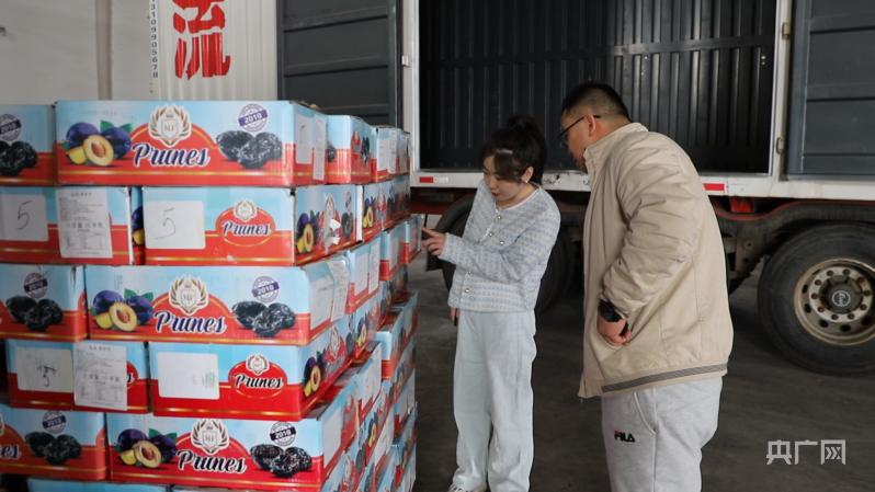 商户正在查验进口李子干 (央广网记者丁安 摄)
