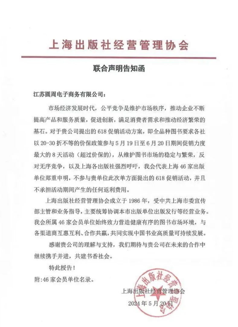 记者注意到,这两份“联合声明告知函”均表示,针对江苏圆周电子商务有限公司提出的618促销活动方案,即“全品种图书价保20-30折(20%到30%的折扣)参与5月19日至6月20日期间累计8天的促销活动”,出版社不参与,也不承担活动期间产生的任何返利费用。落款日期也均为5月20日,也就是各大电商平台开始618大促销的日期。