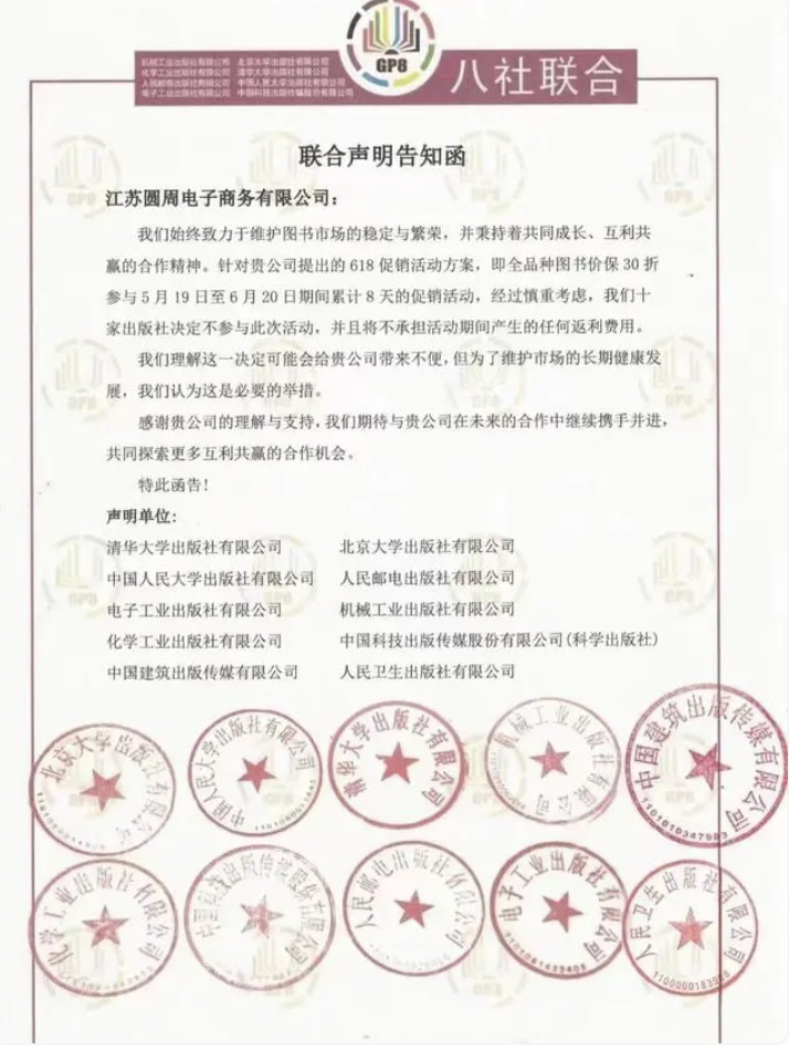 在北京10家出版机构发布的《联合声明告知函》中提到,“对于贵公司(江苏圆周电子商务有限公司)提出的618促销活动方案,经过慎重考虑,我们十家出版社决定不参与此次互动,并且将不承担活动期间产生的任何返利费用。”该声明同时表示,“为了维护市场的长期健康发展,我们认为这是必要的举措。”