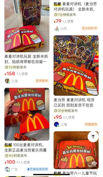 以当下最火的麦麦对讲机为例,最高已经涨到了158元一套,平均售价在80元上下。而这套麦麦对讲机的官方加购价为38元,在麦当劳任意消费即可加购。此前肯德基最出圈的可达鸭,曾经在二手交易平台最高溢价至500元,以500元来算,仅一个套餐内玩具的价格,就已经是套餐本身价格(以59元计)的8倍多。