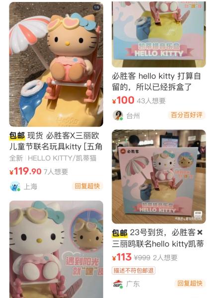 记者注意到,不少今天没有抢到麦麦对讲机的人,已经迅速“转战”闲鱼等二手平台下单了。几乎与官方上新同步,目前闲鱼上已经有一大堆“麦麦对讲机”溢价出售,也有肯德基超大号版宝可梦、必胜客kitty等,均可以单独买到。