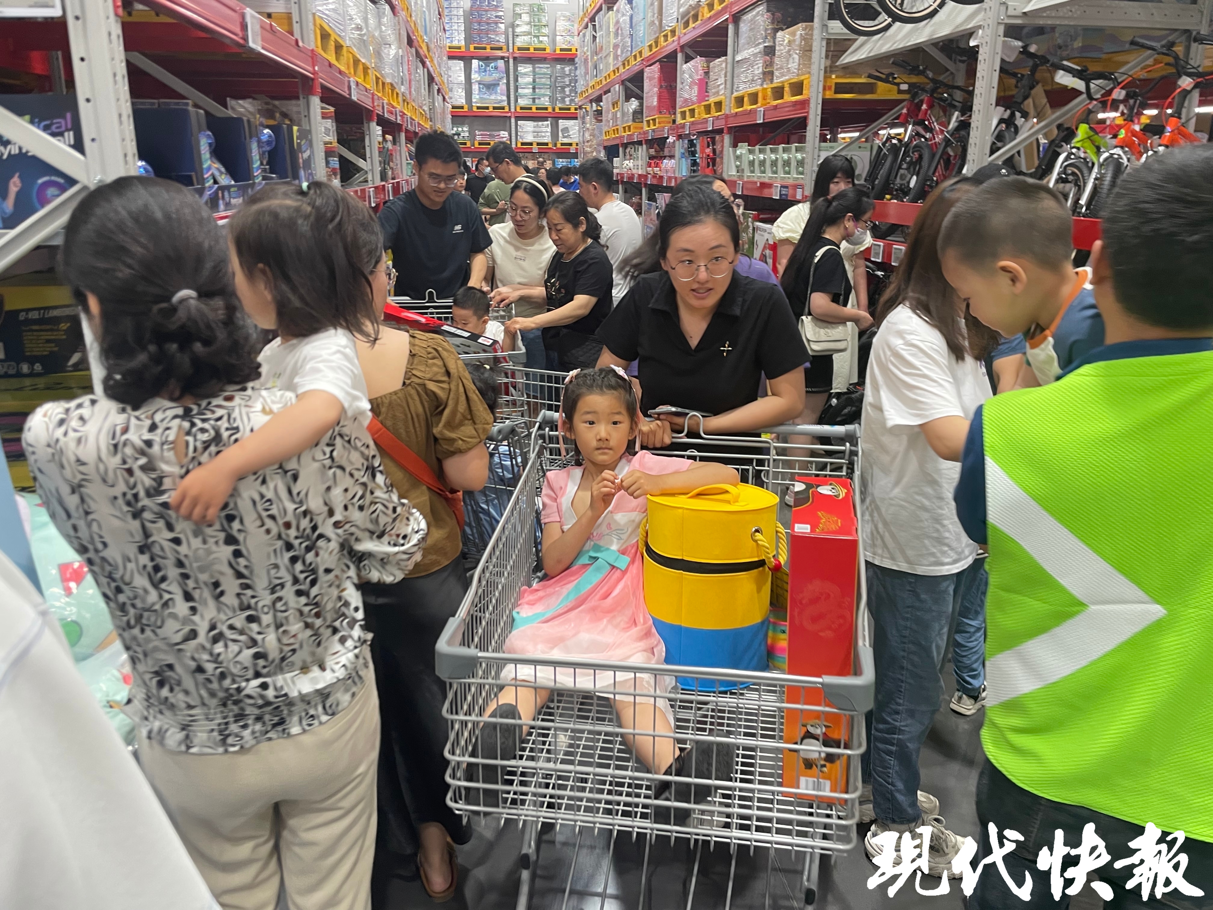 顾客张女士的购物车内,除了吃的喝的用的,还有一个黄色的大盒子。“这是一个挖掘机套装,孩子很喜欢,货柜上有拆开来展示的,质量看着挺不错的,199元的价格也不算贵。”张女士说,正好给儿子当儿童节礼物。顾客王先生则为女儿挑选了一件公主裙。“这件淡黄色的,女儿很喜欢,价格也合适,就买了给孩子‘六一’穿。”当天,山姆江北店还推出了99.9元的小黄人抱抱桶,绒布做成的小黄人既是包装盒,也是玩具,里面装的是山楂等孩子爱吃的零食。现代快报记者注意到,不少购物车内都有这么一个小黄人抱抱桶。