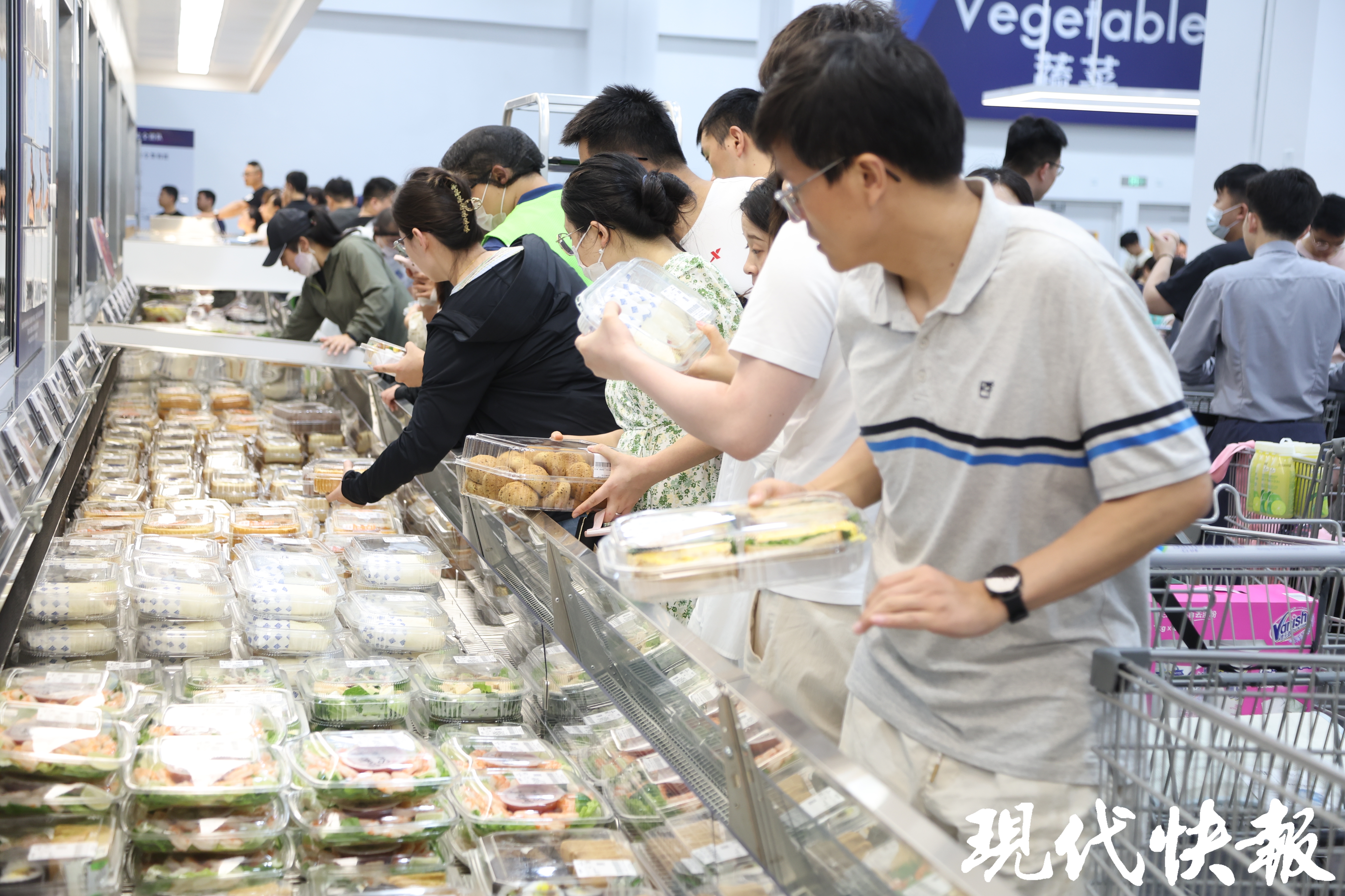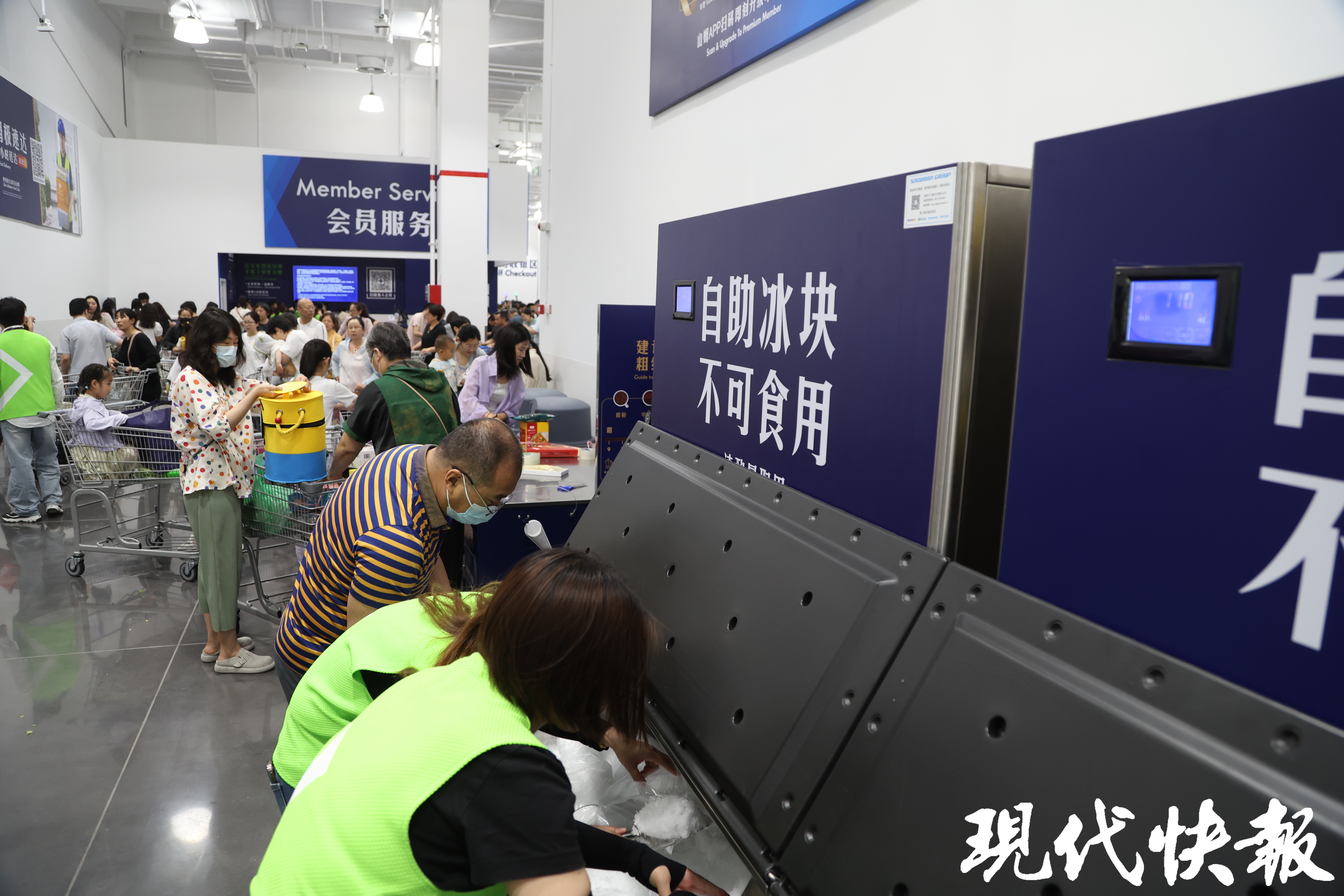 记者注意到,不少顾客都是逛累了、逛饿了才结账出来。在出口处,有些顾客等不及,打开刚买的美味就品尝起来。现代快报记者注意到,出口处的自助打包台让顾客感觉很方便,另一侧的自助冰块区域,很多购买生鲜的顾客可以自取。