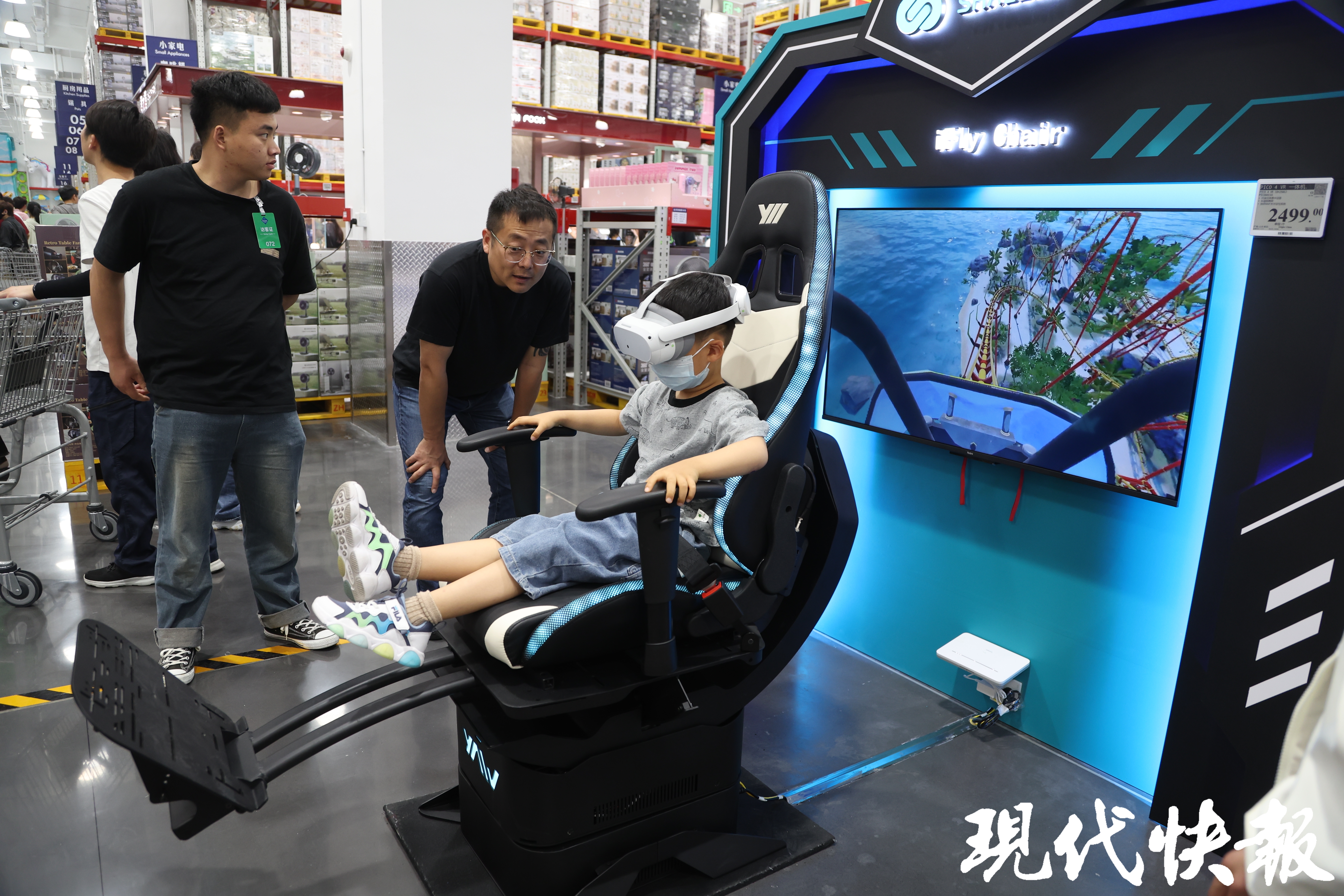 山姆江北店吸引顾客的,不仅仅是商品本身,还有独特的购物体验。在山姆江北店的眼镜中心,除了可以购买光学镜、太阳镜,还可以免费验光。眼镜中心不远处的VR动感座椅吸引着许多小朋友顾客排队体验。该座椅厂商工作人员马先生告诉现代快报记者,这款座椅可以和电脑联网,玩过山车、赛车竞速、飞行模拟等游戏。“它可以 360°无限旋转,最高速度1圈/秒,可以体验到不一样的游戏玩法。”马先生表示,在中国的山姆会员商店中,只有南京江北店有这款“飞椅”,售价49999元。