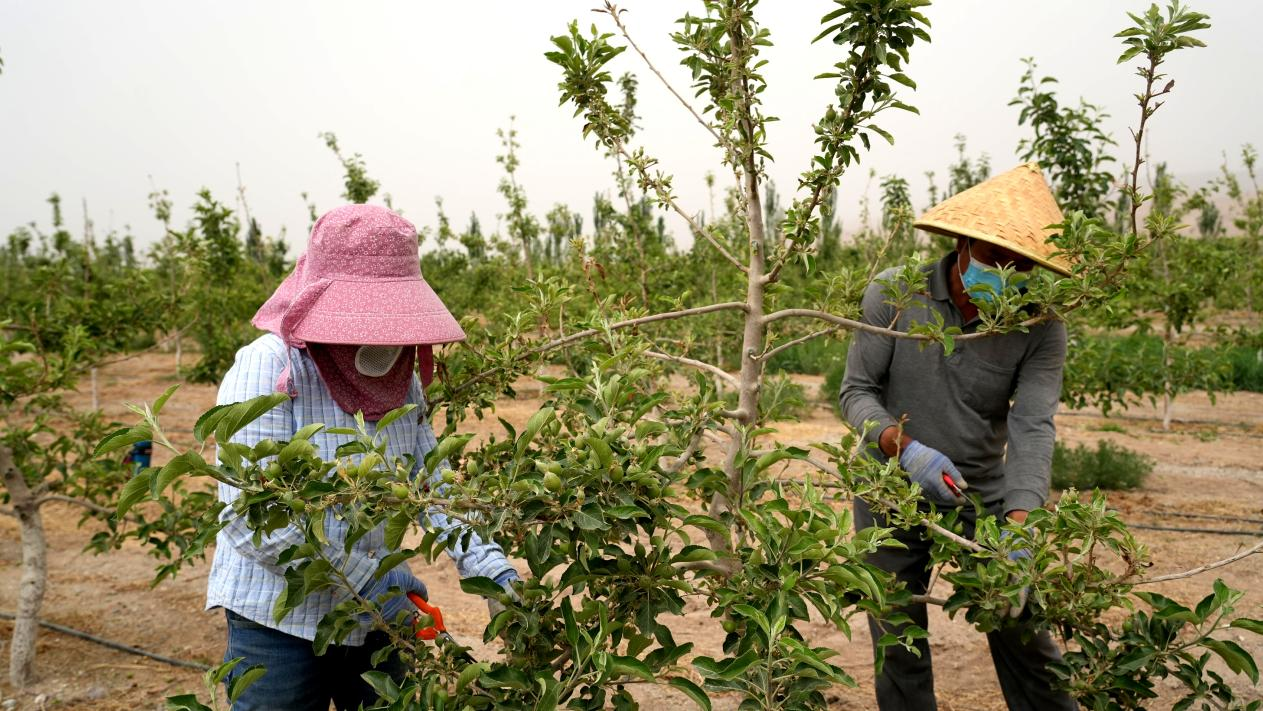 阿克苏冰雪蜜脆园内,数千亩果园生机勃勃。果农们头戴遮阳帽,手持剪刀,穿梭于维纳斯黄金、王林、瑞雪、爱妃等苹果树间,细心疏果。这几天,在公司承包了130亩爱妃苹果的种植户唐奎,正在组织20多名工人细心挑选,去除多余幼果,确保剩余果实茁壮成长,绘就一幅丰收前的希望画卷。