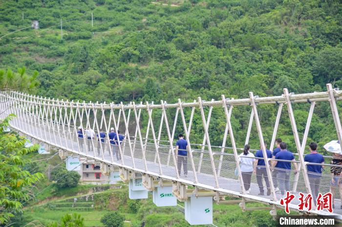5月25日,游客在三华李主题度假区钢格栅索桥上游玩。(三华李主题度假区供图)