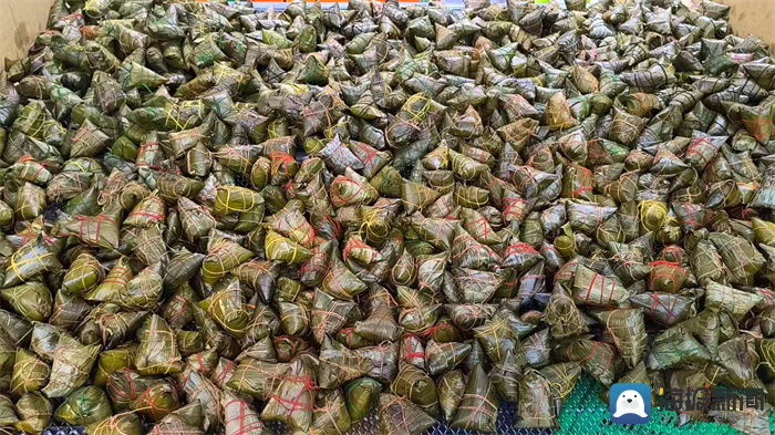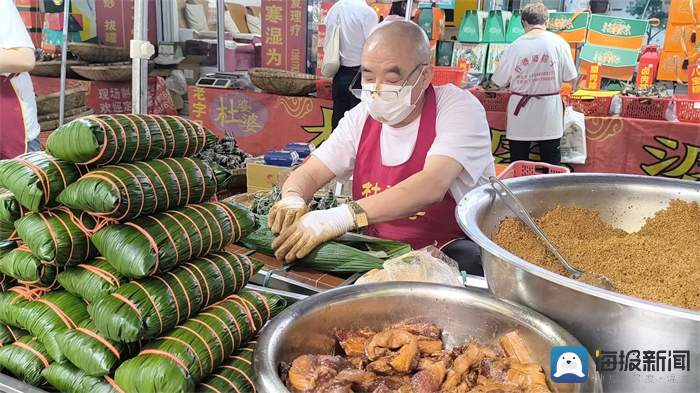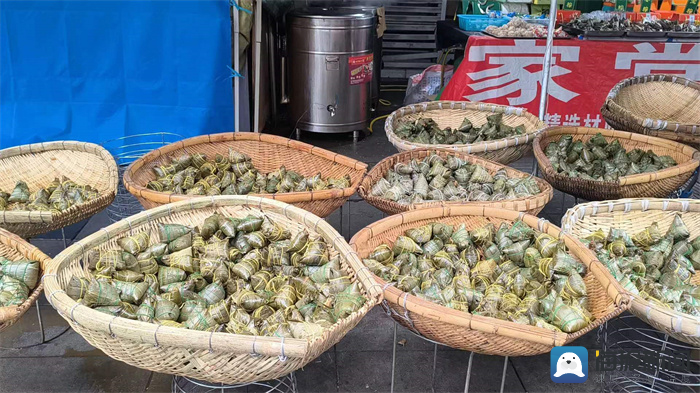 马婆婆的粽子店门前有不少市民前来选购,马天林告诉记者,自家店里有4个人在制作粽子,边煮边卖,基本上都是当天包的当天卖完。“一个人一天要包500斤米,我们每天要包差不多2000斤米。100斤米可以出800多个粽子,每天差不多要包10000多个粽子。”马天林介绍,店员大概每天早上7点左右就开始包,如果有单位订购,需要赶工期,那就会通宵包粽子。