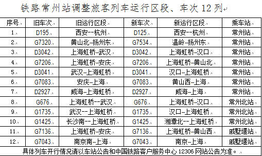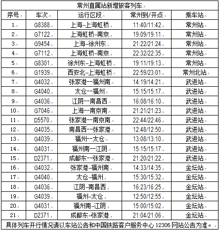 新图实施后,铁路常州站开行旅客列车613列,其中常州站开行349列,常州北站开行145列,戚墅堰站开行12列,武进站开行56列,金坛站开行51列。本次运行图调整后,铁路常州站新增旅客列车21列,其中常州站5列,常州北站1列,武进站9列,金坛站6列。新图中,铁路常州站调整旅客列车运行区段、车次12列。